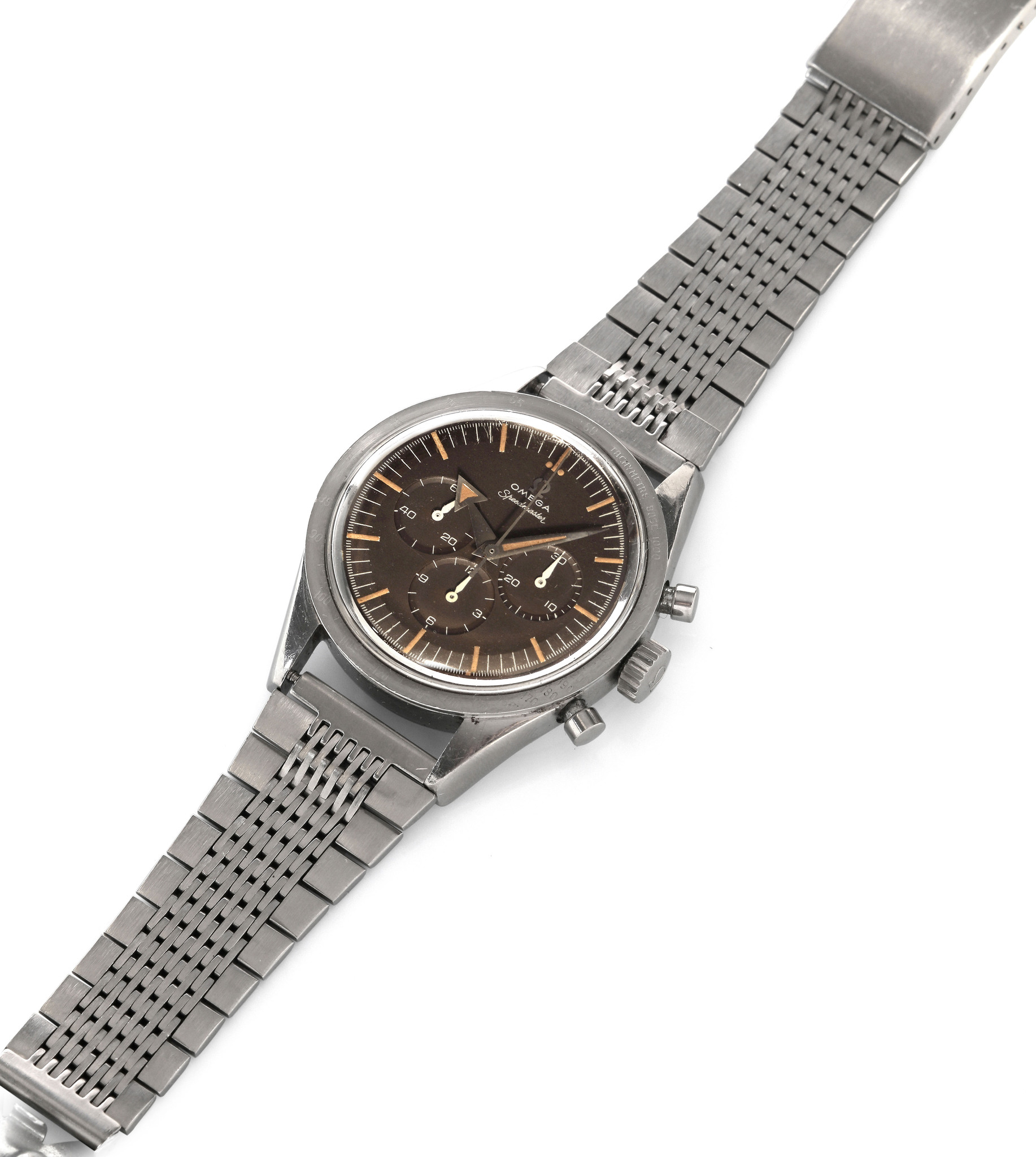 While the bracelet is a later-period replacement, its presence does not detract from the overwhelming originality and authenticity of the watch head, the true essence of collectability in an early Speedmaster. All key components remain correct for the reference and era, placing this example firmly among the most compelling surviving CK2915-1 watches known.