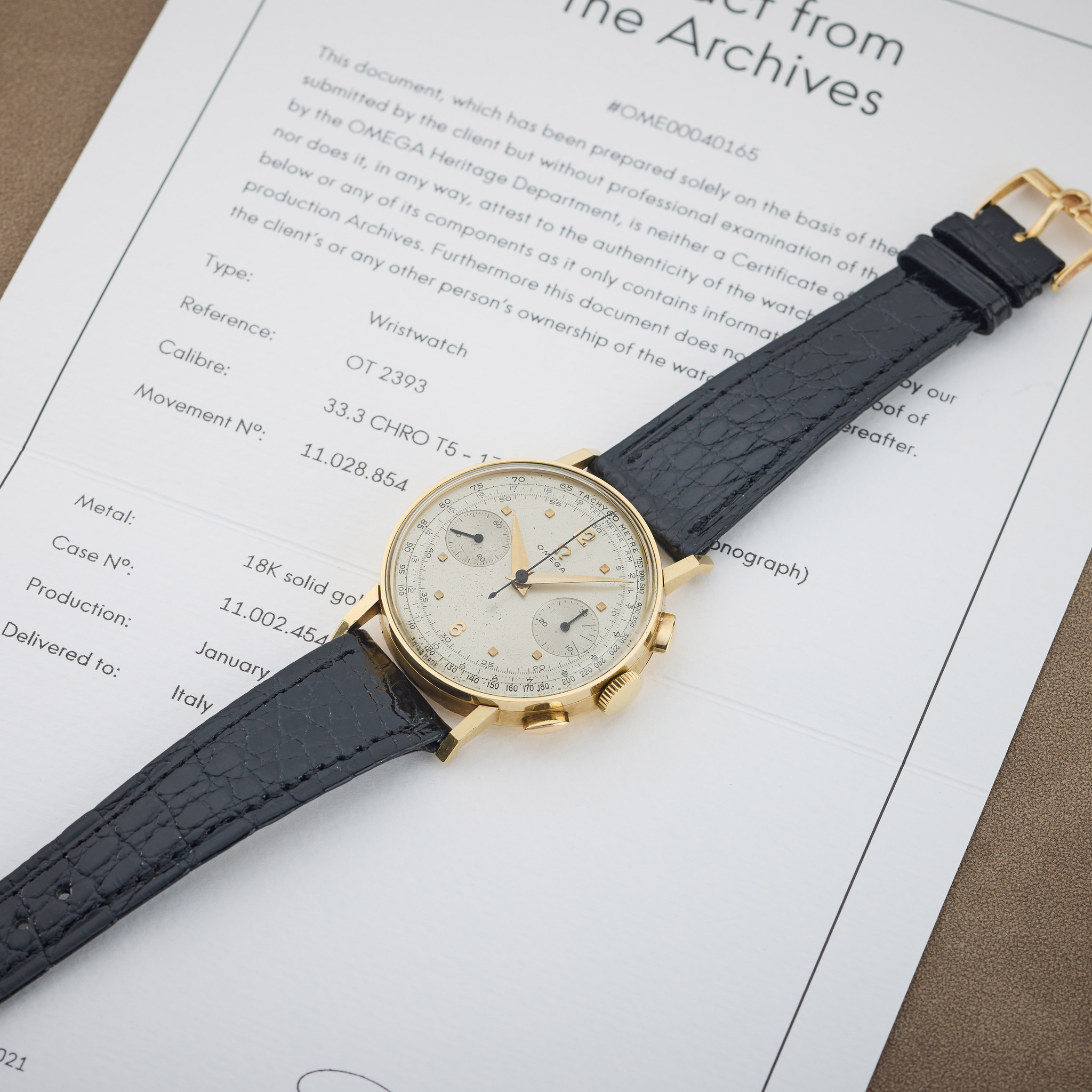 This timepiece (Ref. OT 2393) features Omega’s prestigious 33.3 CHRO T5-170 manual-winding chronograph movement (No. 11.028.854), housed in an 18K solid gold case (No. 11.002.454). Manufactured on January 28, 1960, and originally delivered to Italy, it represents one of Omega’s significant chronograph models from this period. The caliber 33.3 CHRO T5 is historically important as part of Omega’s development of precision chronographs in the mid-20th century. The watch’s provenance is confirmed by Extract from the Archives document #OME00040165 issued by the Omega Heritage Department in Bienne on January 8, 2021.