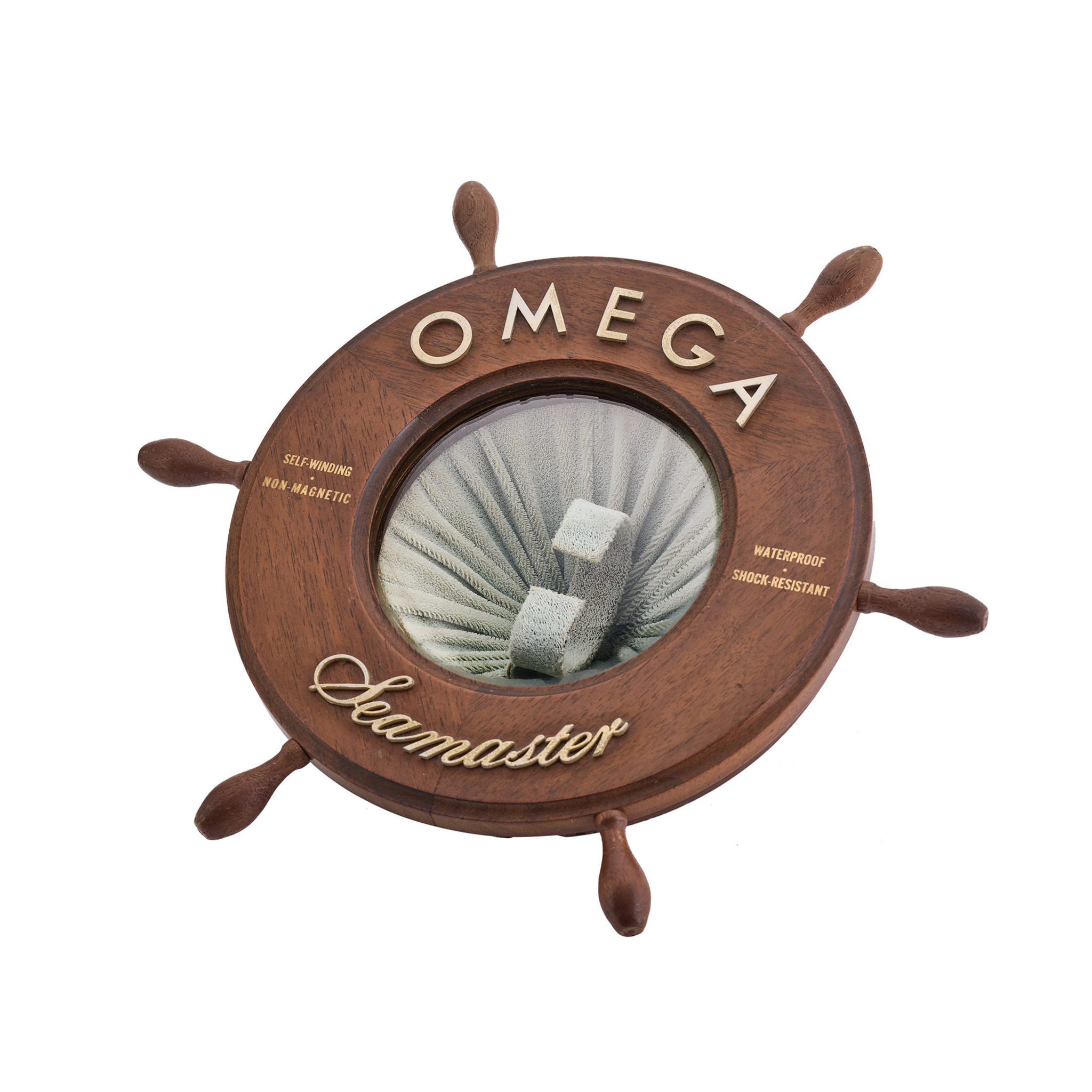 A fine and very rare, wooden display watch box in the shape of boat wheel, with Omeaga and Seamaster logo, made in U.S.A D-40.