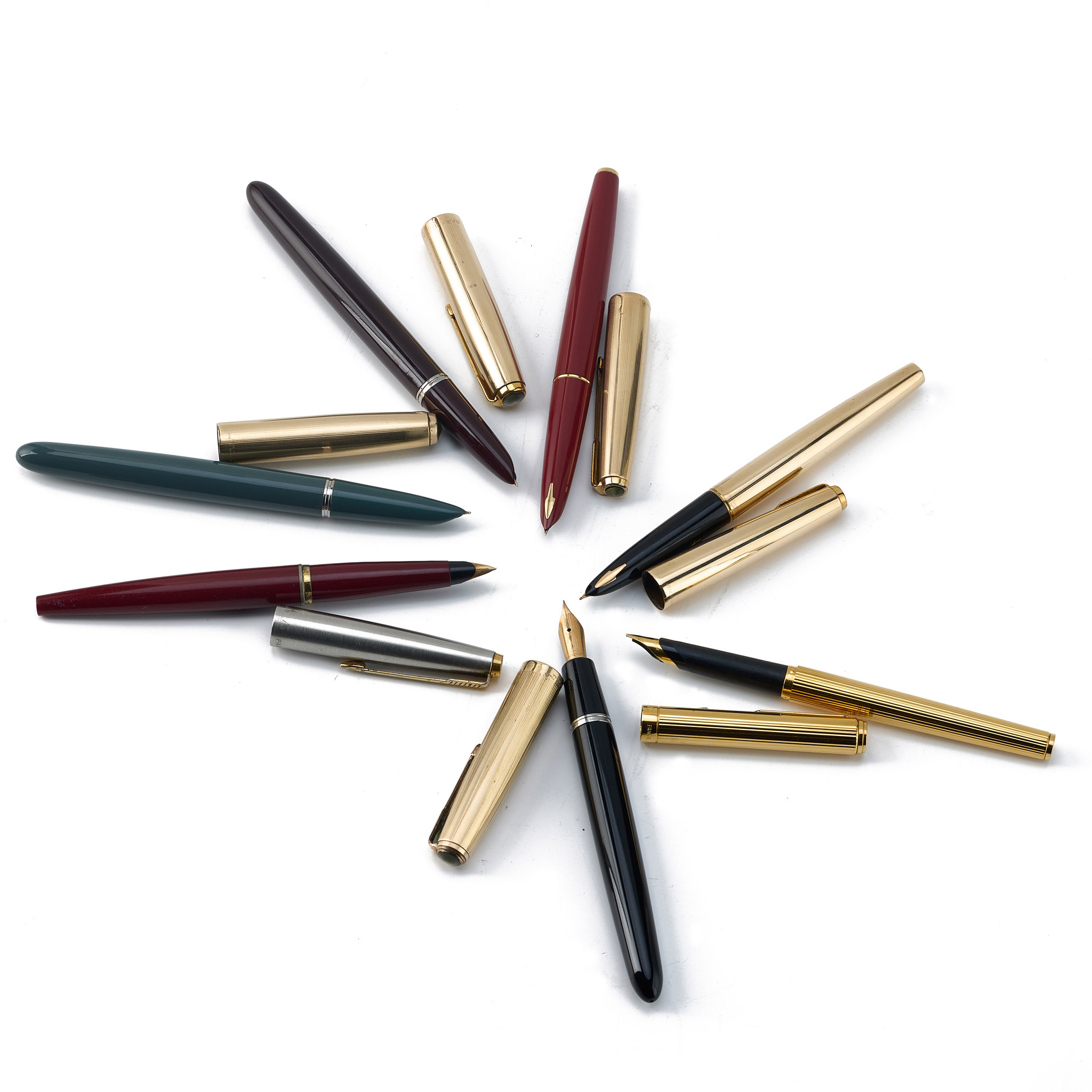A special set of 7 writing instruments: 1) Parker Vintage 61 Fountain Pen (Rage Red) The gold-plated clip carries the Parker golden arrow, gold-plated cap ring, the nib is crafted from 14K gold and coated in rhodium.