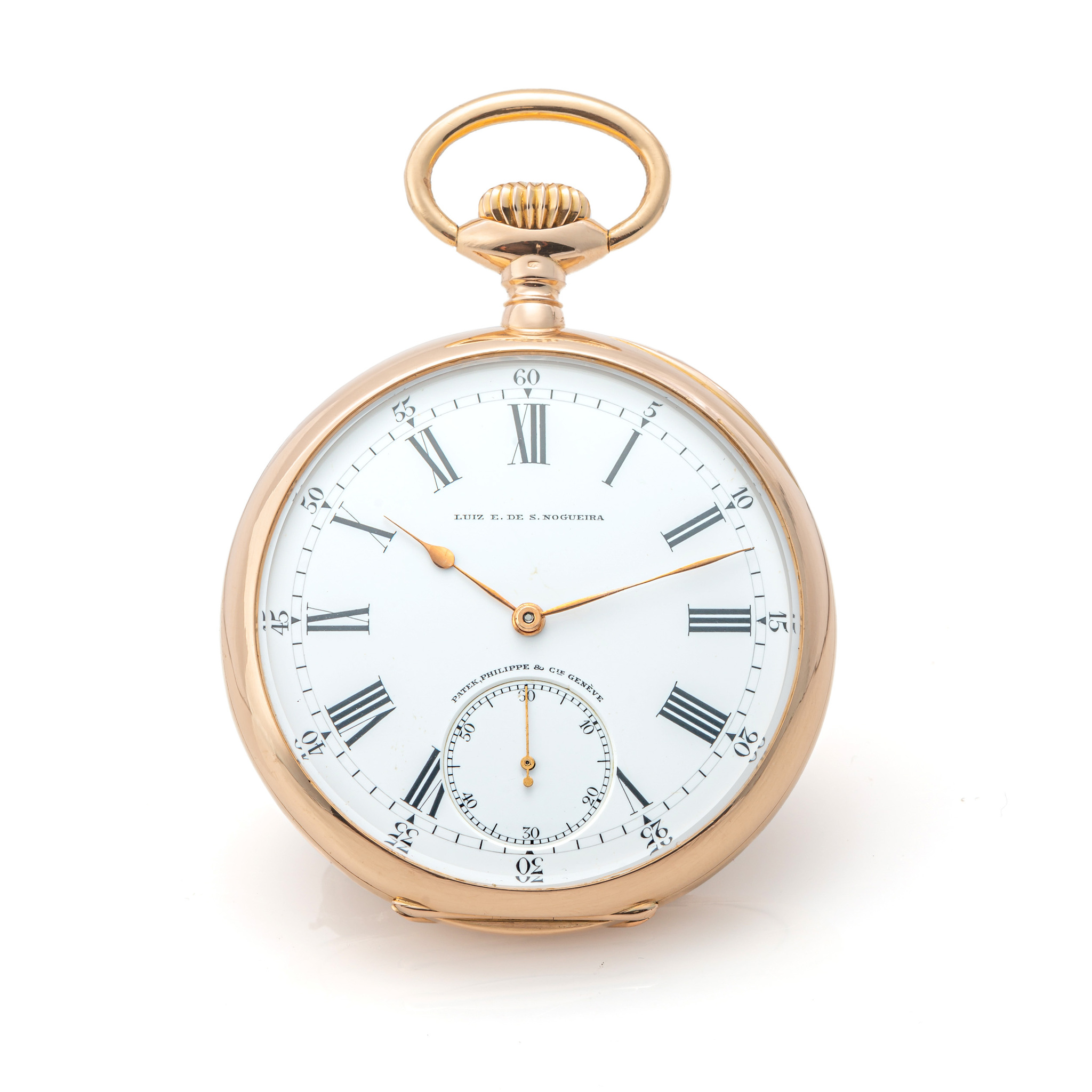 Caliber 21’’’ gilded brass, with going barrel, train of gold wheels, straight-line equilibrated lever escapement, à moustaches, compensated balance with gold poising screws and blued steel hairspring with terminal curve, patented index regulator with swan-neck spring and micrometric screw