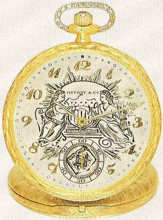 Three body massive "demi-bassine" case engraved overall, with diamond set bow and winding crown, Masonic symbols of the highest grades of the Free Masonry engraved on the back, and on the gold cuvette, the regular symbols are engraved on the dial, inside the back and the cuvette. Mat silver dial with applied gold Breguet numerals and subsidiary seconds, decorated with engraved Masonic symbols. Gold Breguet hands. Fine rhodium plated 16? movement, "fausses cotes" decoration, 18 jewels, two screwed settings, equilibrated straight line lever escapement, cut bimetallic balance, Breguet balance spring with a micrometric index. Signed Tiffany on the dial, both Patek Philippe and Tiffany on the movement. In good condition. Diam. 45 mm.