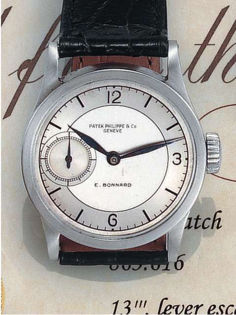 Patek Philippe & Cie, Genève, "Calatrava", No. 136786, case No. 612617, retailed by E. Bonnard. Produced circa 1930.Very fine, rare, and elegant, stainless steel gentleman's wristwatch with off-center seconds dial.