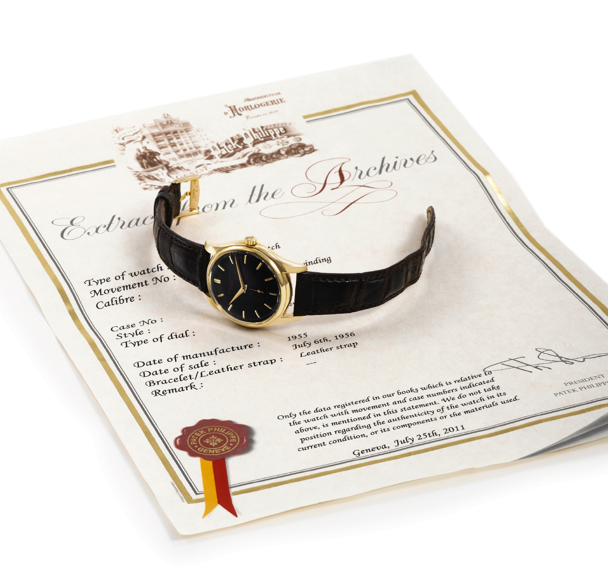 PATEK PHILIPPE REF. 2526 ?BLACK DIAL FIRST GENERATION? Patek Philippe, Genève, No. 762329, Case No. 689066. Sold on July 6th, 1956. Very fine and rare, self-winding, water-resistant, 18K yellow gold wristwatch with an 18K yellow gold Patek Philippe buckle. Accompanied by a 2010 Patek Philippe service receipt and Extract from the Archives.