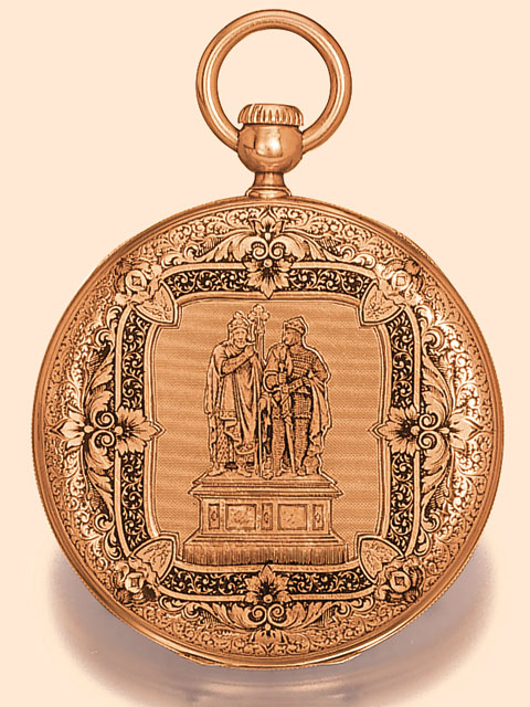 C. Four-body, "bassine et filets", back finely engraved and filled with champlevé black enamel, representing the statue of the two first rulers of Poland - Duke Mieczyslaw I and his son King Boleslaw Chrobry, after Christian Rauch's sculpture created circa 1840 for the Poznan Cathedral, scrolling and floral border, reeded band, gold hinged cuvette. D. White enamel, radial Roman numerals, outer minute divisions, secured by two small screws. Blued steel Breguet hands. M. 40 mm. (18'''), Cal 9, frsted gilt, hanging barrel with Geneva stop work, cylinder escapement, three-arm gilt balance with flat balance spring, 3rd Philippe winding/setting system.Signed on dial, case and movement, movement in addition punched with the maker's trademark under the dial.Diam. 45 mm.