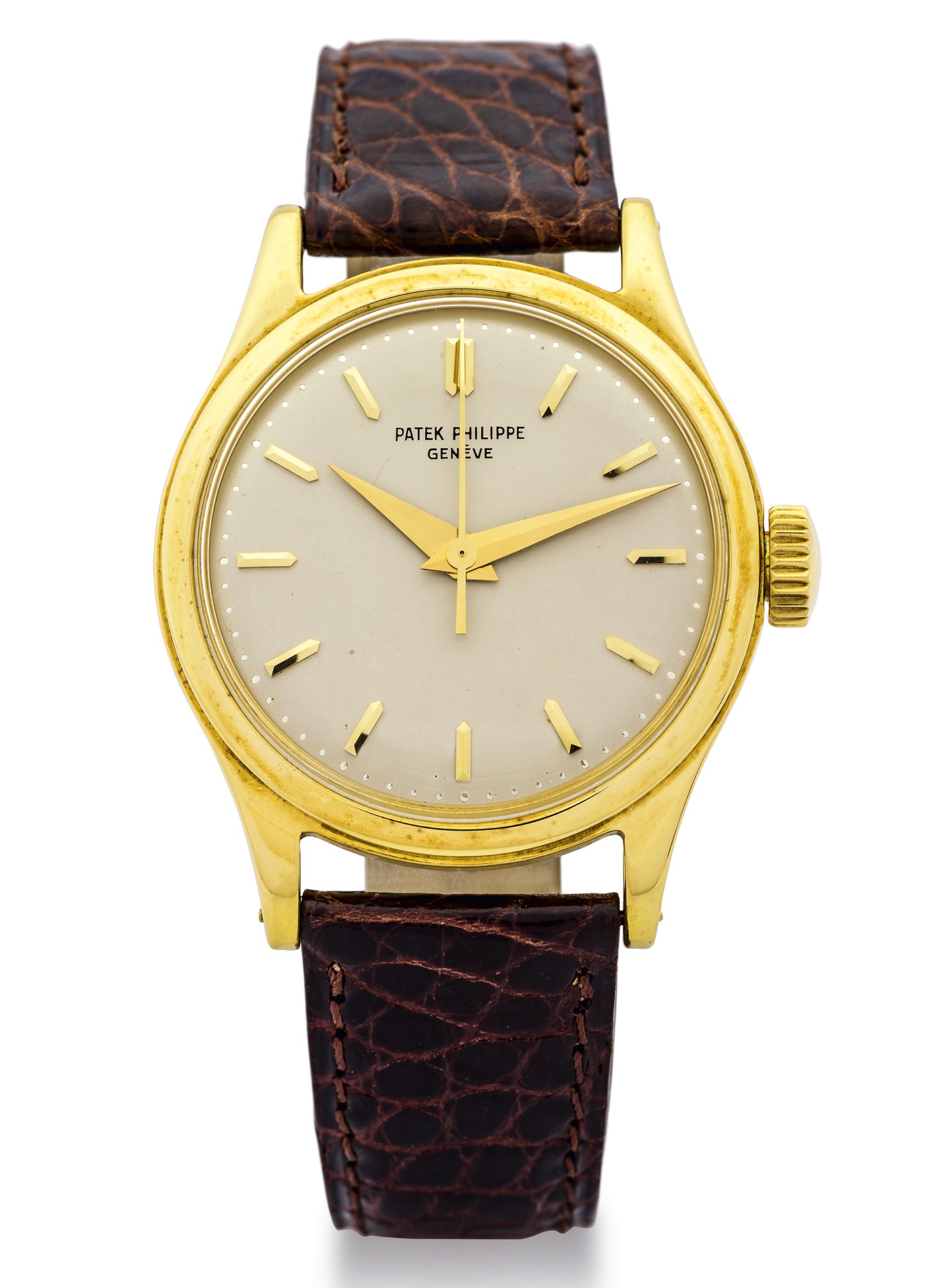 Two-body, polished and brushed, screw-down case back, stepped bezel, concave lugs, dust protecting cap. Matte silver with applied yellow gold faceted baton indexes, outer 1/5th seconds track. Yellow gold dauphine hands. Cal. 27-SC, rhodium-plated, fausses cotes decoration, 18 jewels, straightline lever escapement, monometallic balance, adjusted to heat, cold, isochronism and five positions, shock absorber, self-compensating blued steel Breguet balance spring.