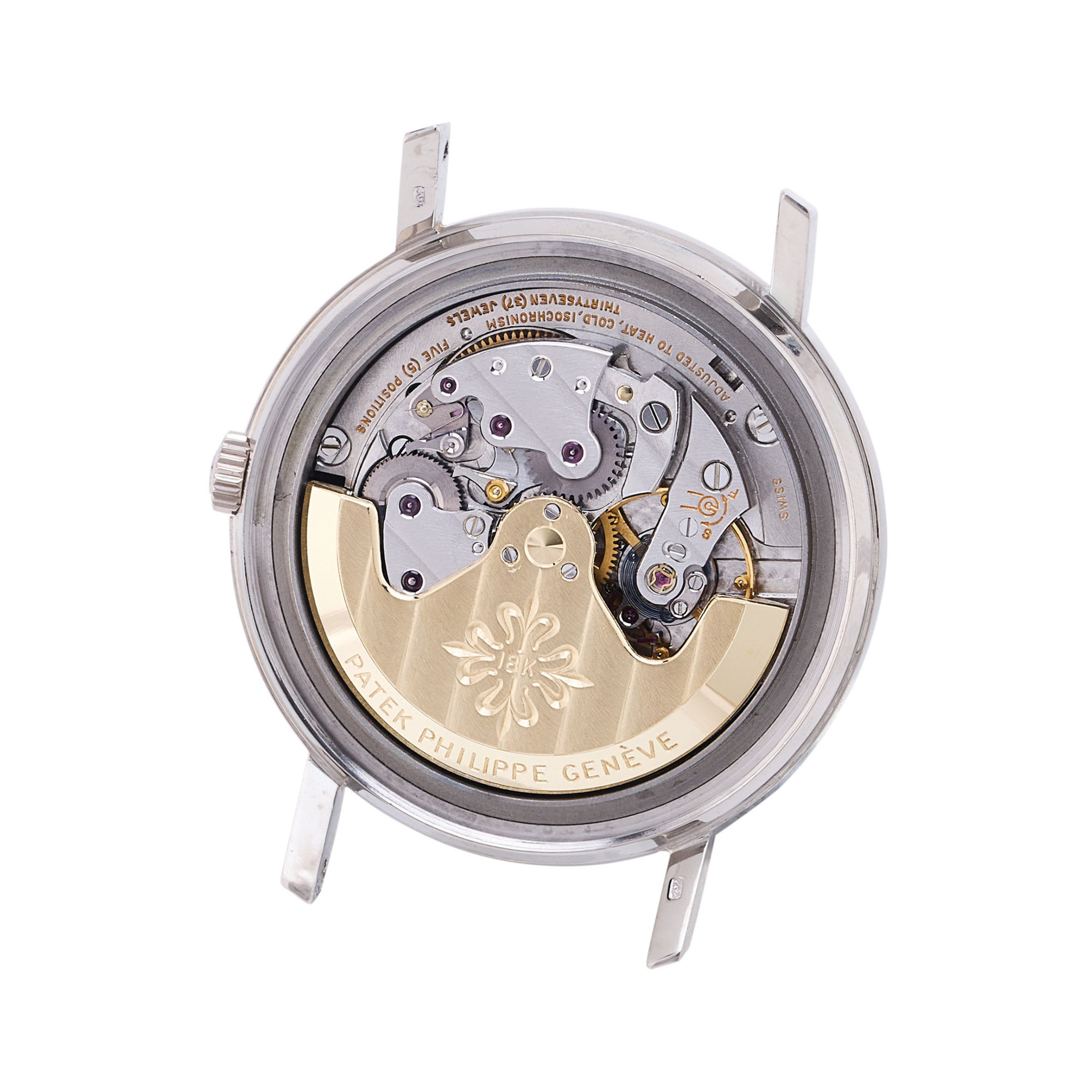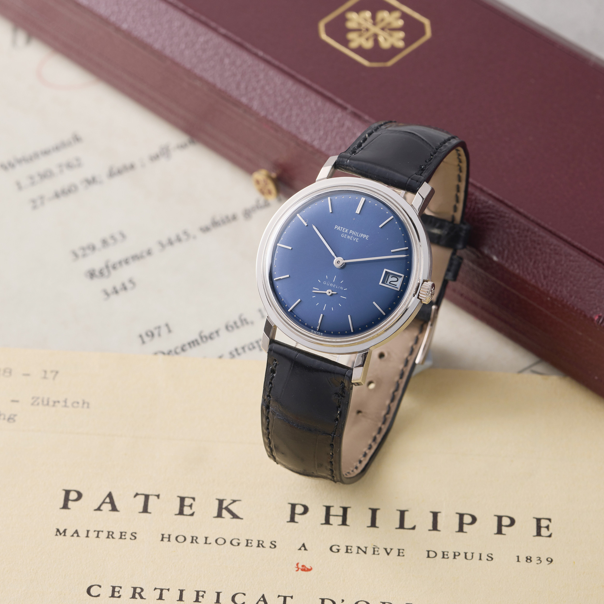 PATEK PHILIPPE, REF. 3445, CALATRAVA, BLUE DIAL, RETAILED BY GUBELIN, 18K WHITE GOLD