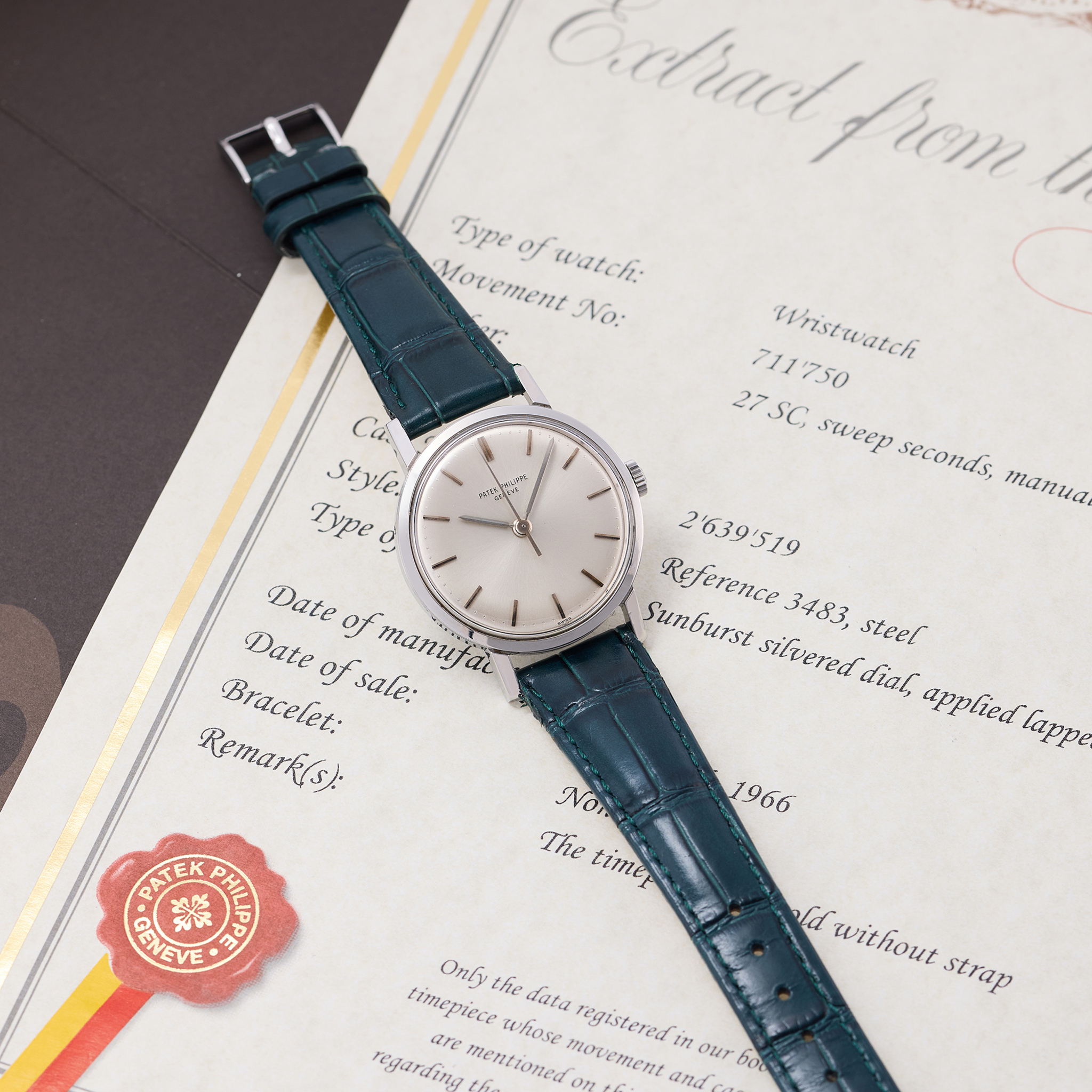 The presented example remains in excellent condition, with strong case and original silver sunburst dial, hard enamel signature. It comes with an Extract from the Archives, dated February 9th, 2023, which records the sale of this watch on March 4th, 1966, adding to its historical charm.
