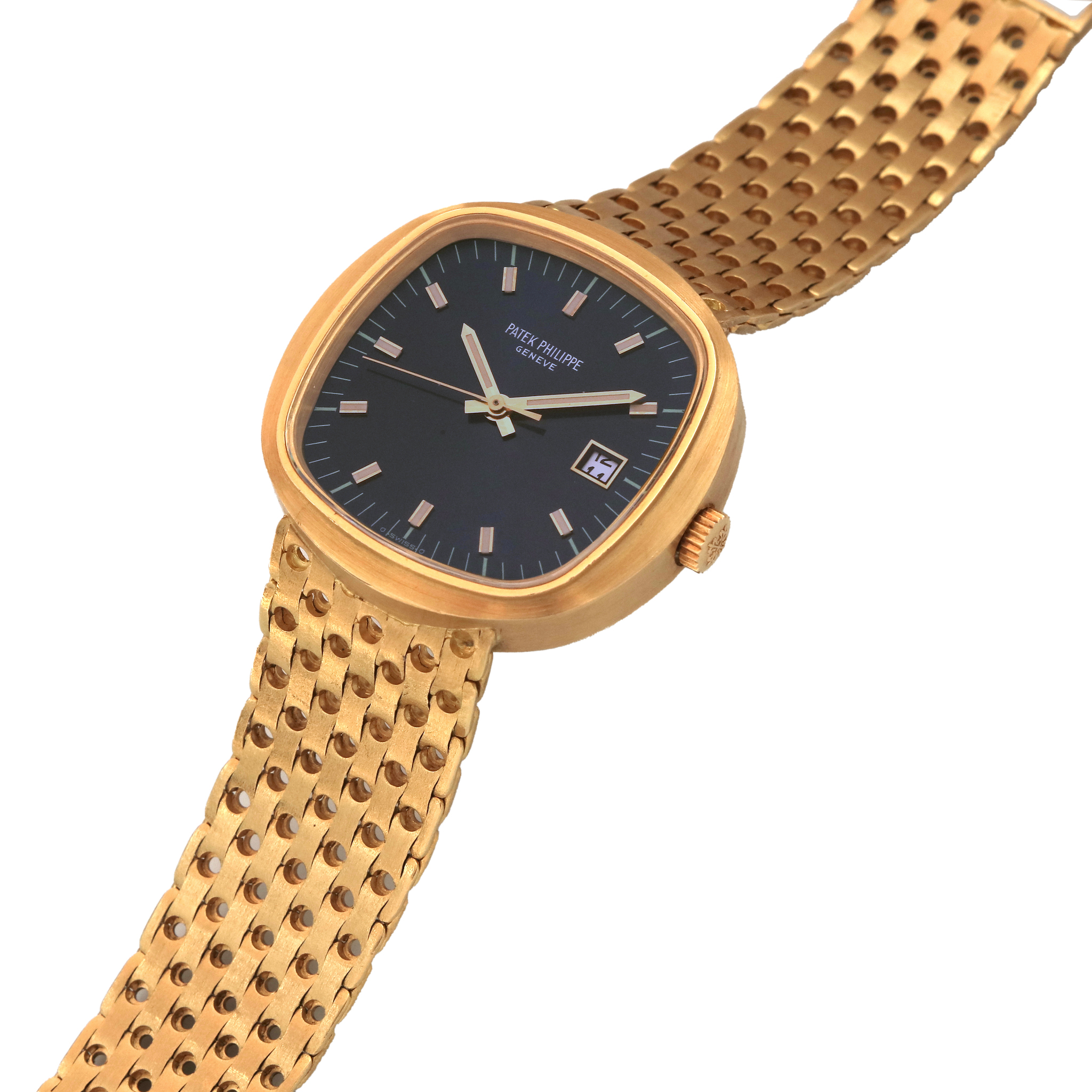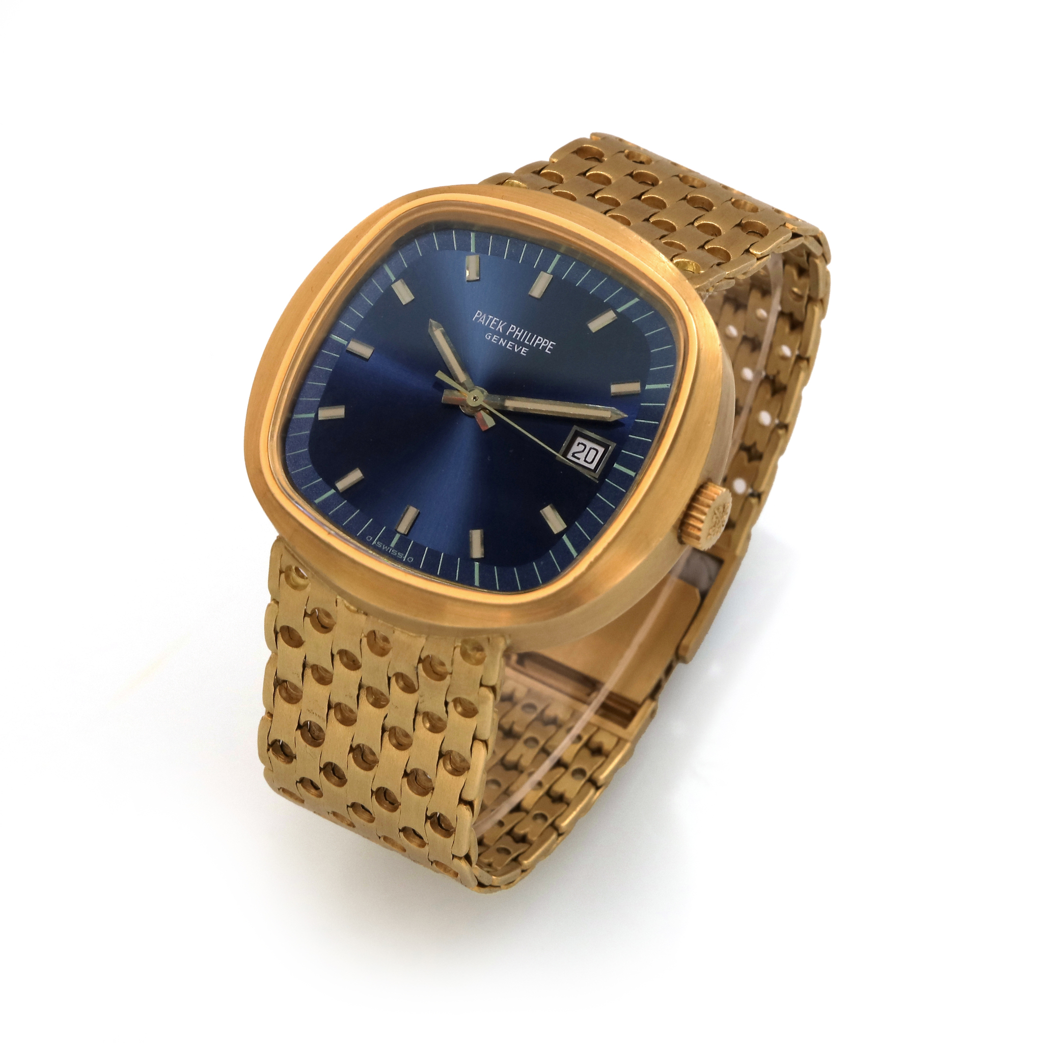 A fine and rare, large, 18k yellow gold quartz wristwatch with blue dial, raised yellow gold indexes, date and centre second and 18k yellow gold pierced patek philippe bracelet