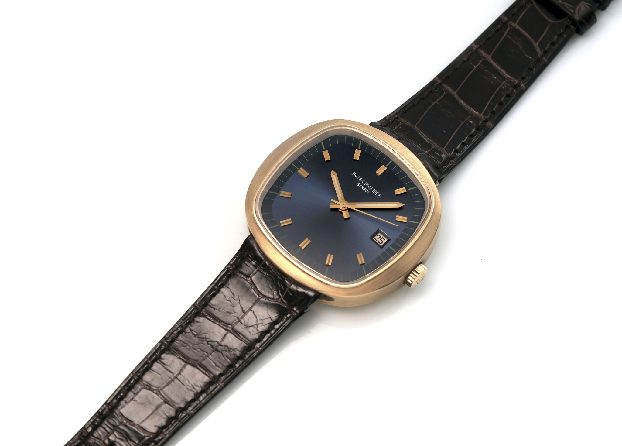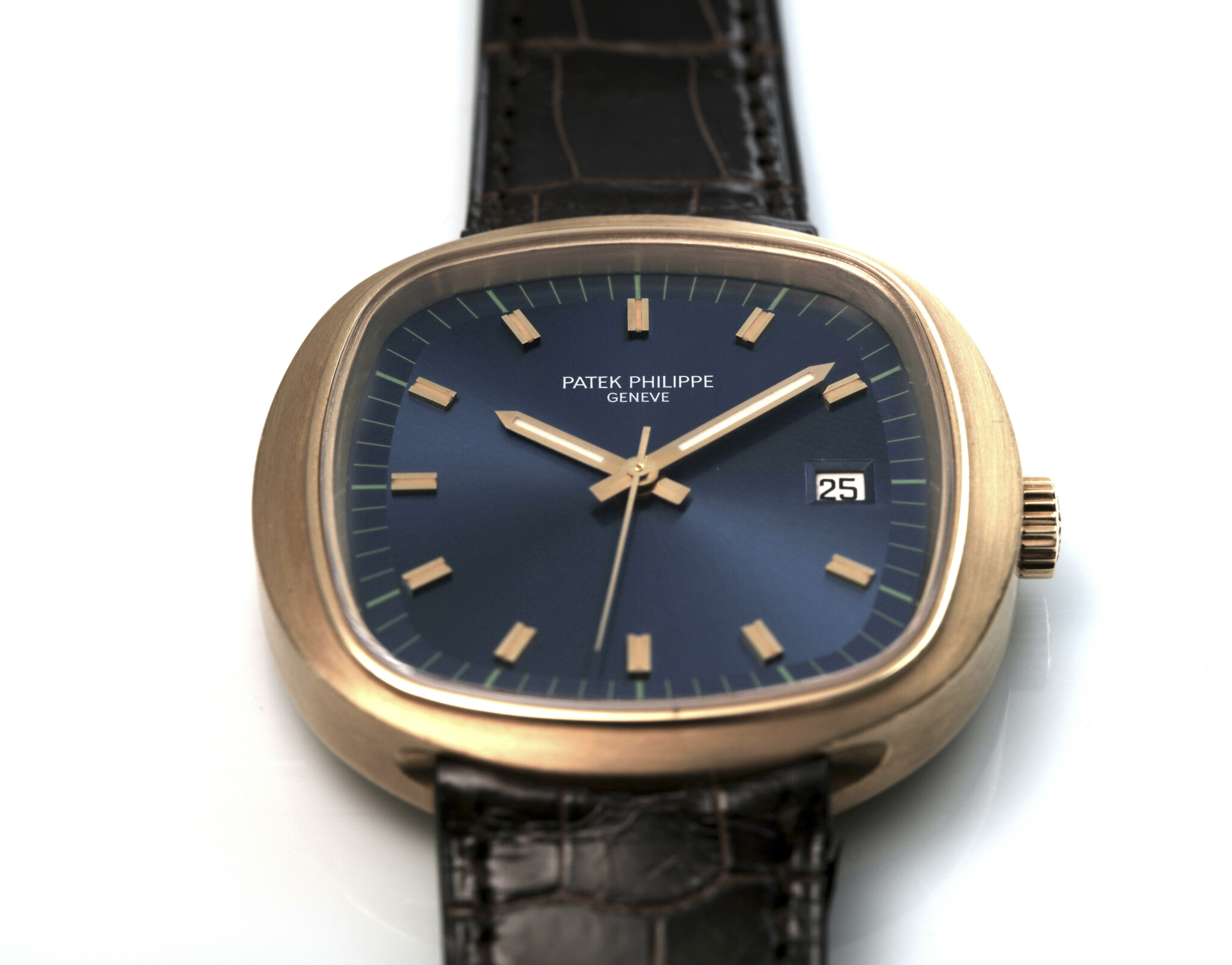 A rare and oversized 18k yellow gold cushion shaped quartz wristwatch with blue dial, center second and date
