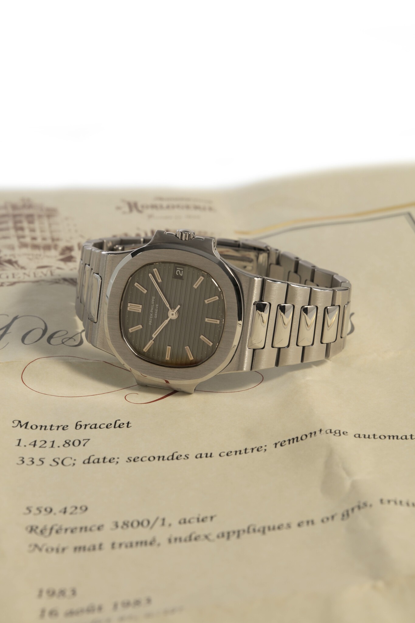 Introduced in 1981, the Nautilus 3800 extended the design language established by Gérald Genta with the original 3700, translating the iconic porthole case and horizontally embossed dial into a more compact and versatile size. Early examples such as this one share many of the most desirable aesthetic traits of the first-generation Nautilus: thinner profile, first-series dial typography, black date, and elegant applied gold hour markers with sigma signature (“σ T SWISS T σ”), attesting to the use of precious metal on the dial furniture.