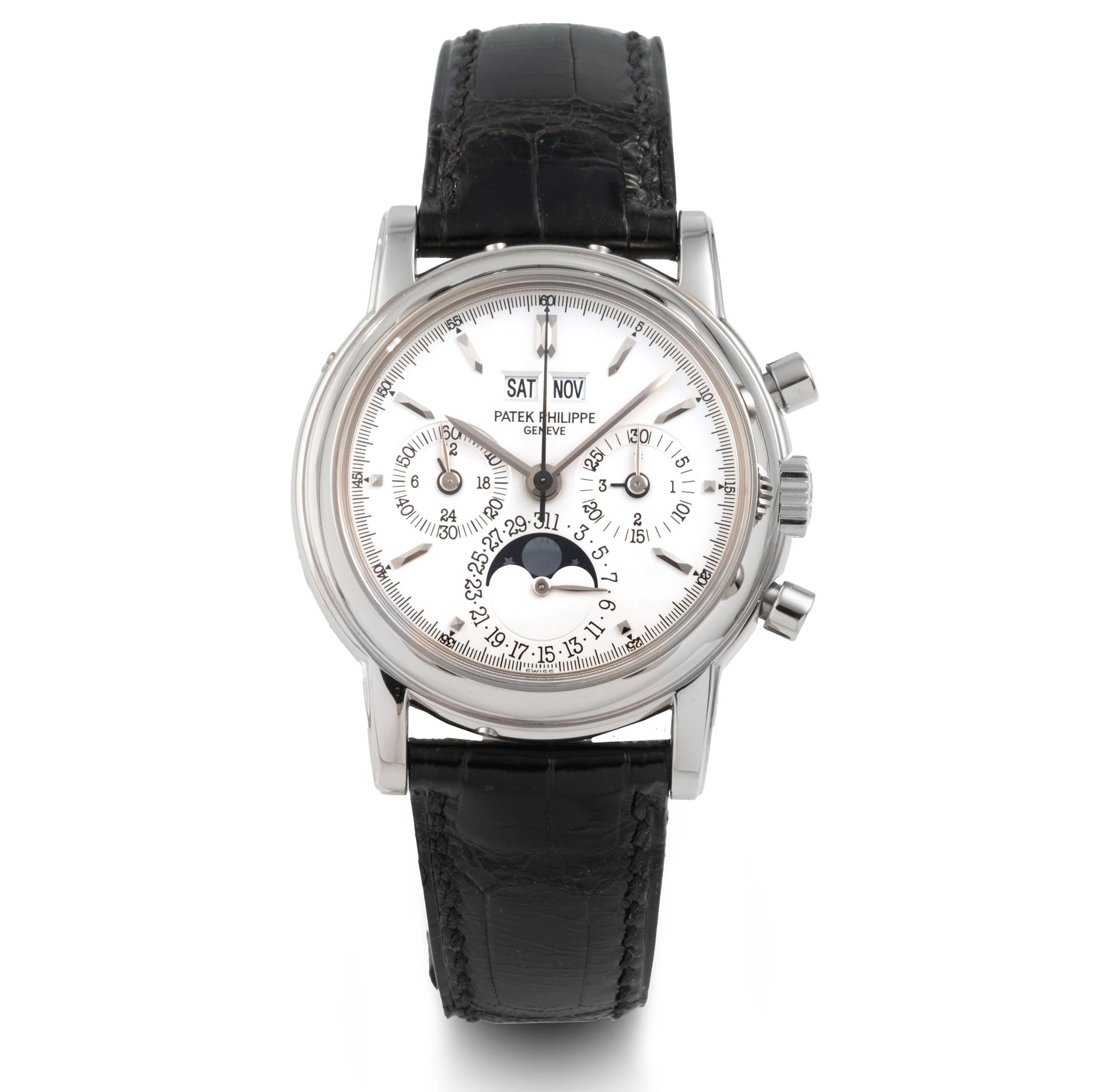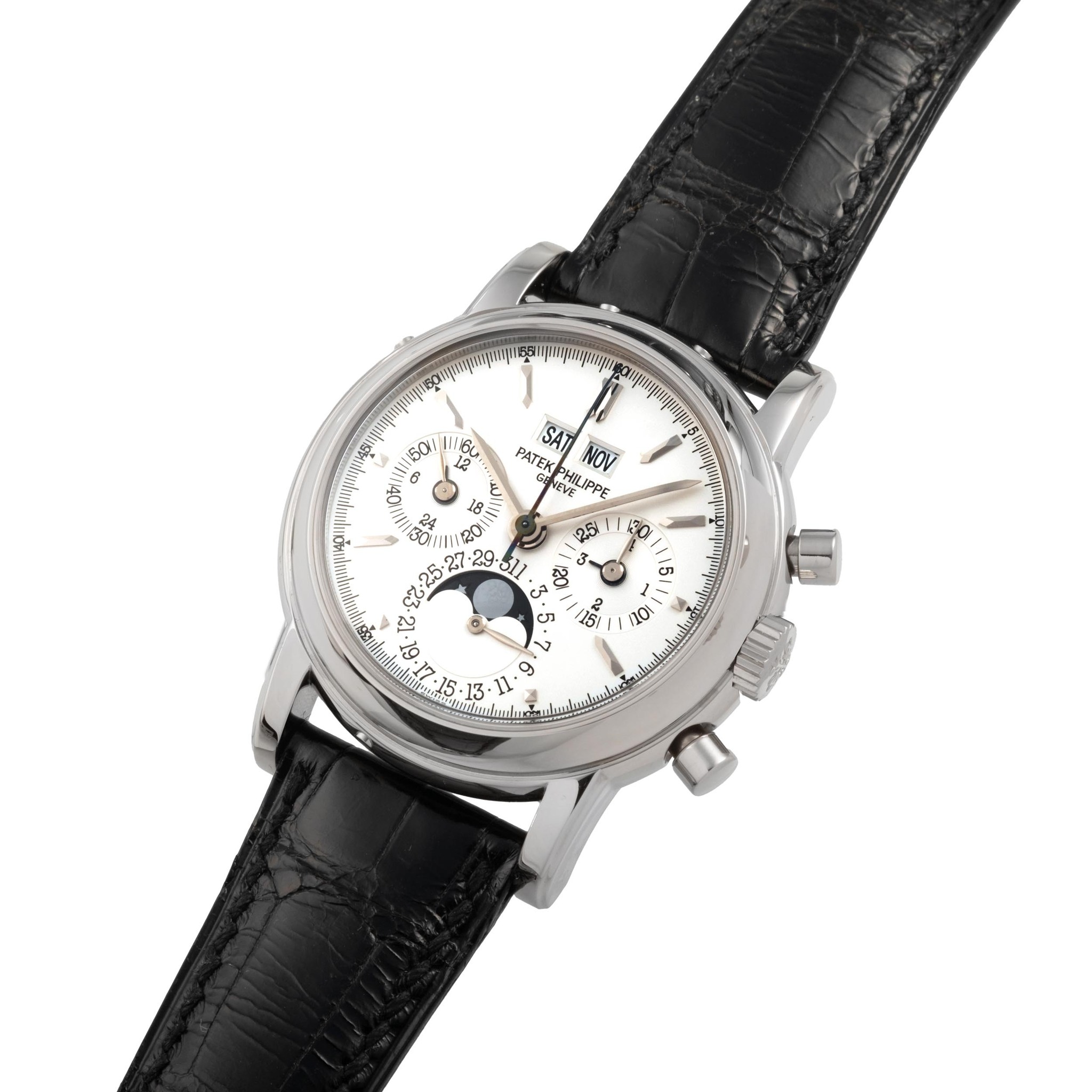 A fine, rare and desirable, 18k white gold, manual wind perpetual calendar wristwatch with chronograph and moonphase