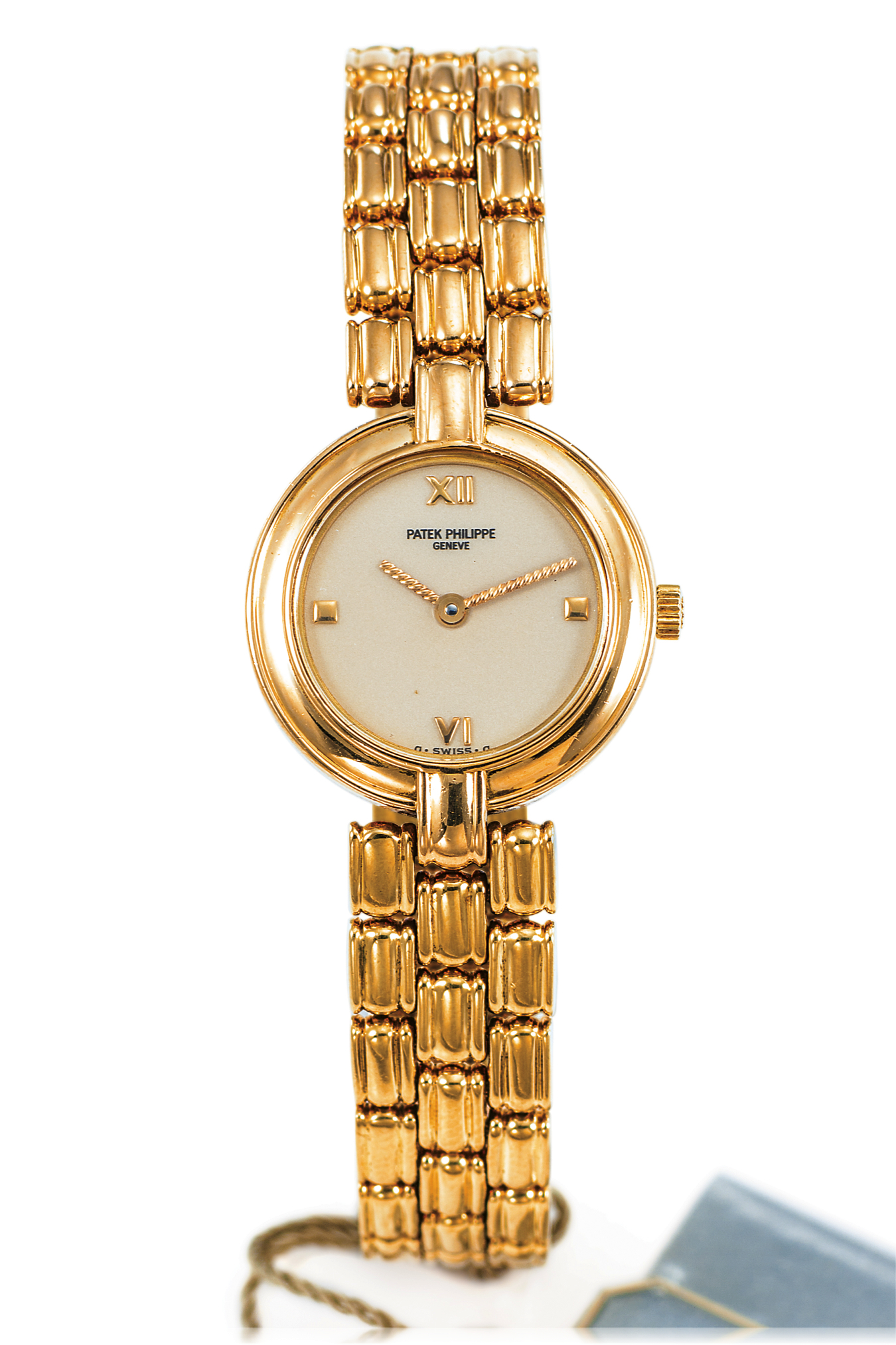 PATEK PHILIPPE REF. 4727/1 YELLOW GOLD Patek Philippe, Genève, No. 1604027, Ref. 4727/1. Made circa 1980s. Fine, water-resistant, 18K yellow gold lady's quartz lady's wristwatch with an 18K yellow gold Patek Philippe bracelet composed of three-row rectangular fluted links.