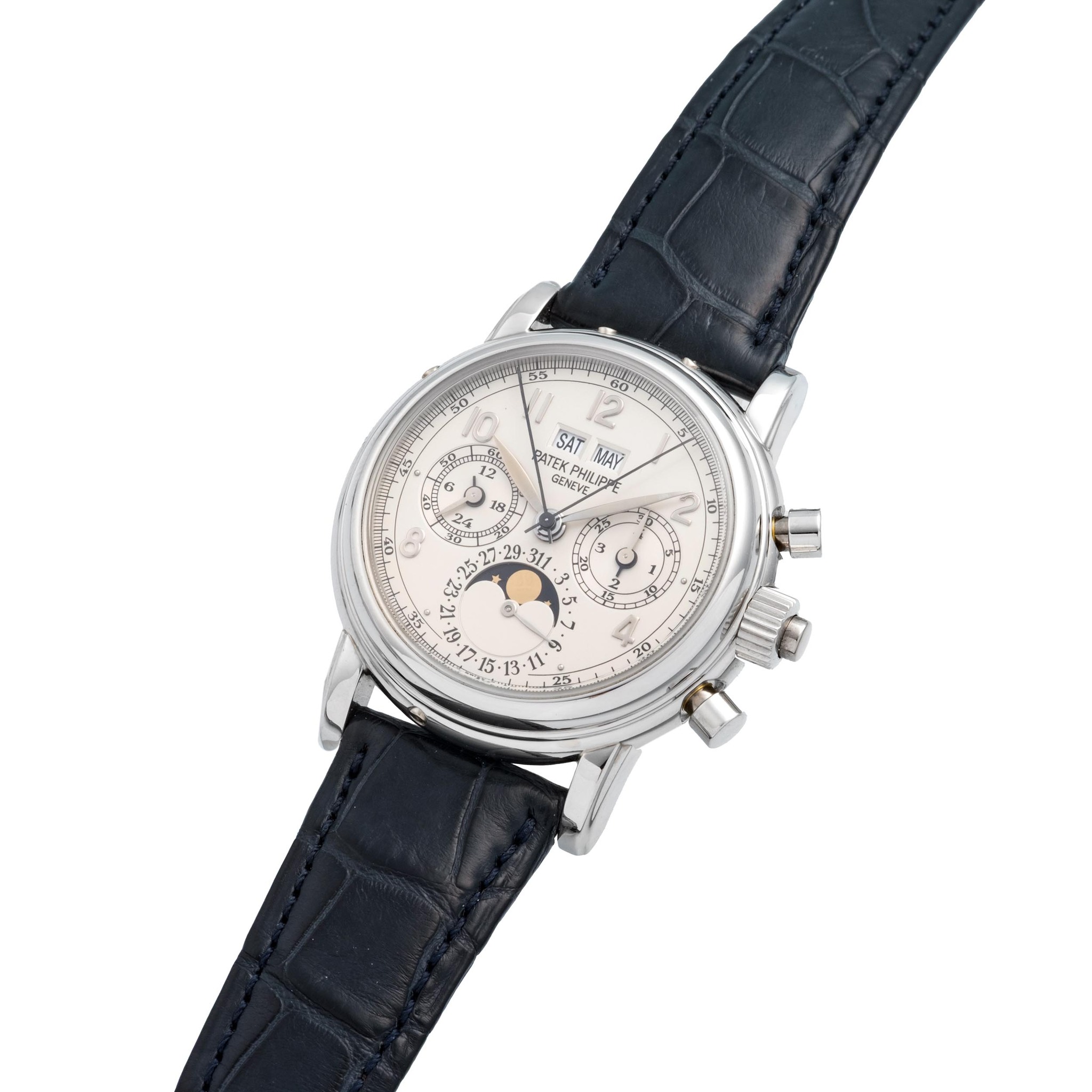This example made in 2005, is part of the first generation of this complicated perpetual calendar split second chronograph. Instantly recognisable by its short split-second hands (longer hands were introduced circa 1998) and its large split-second block on the movement (such as this example). These first generation examples are extremely rare as only produced for 3 years as the second generation was produced for more than 14 years. Kept in overall great condition with nicely defined lugs and clear hallmarks, the reference 5004 will only continue to grow in popularity as proven by recent auction results, especially for early examples.
