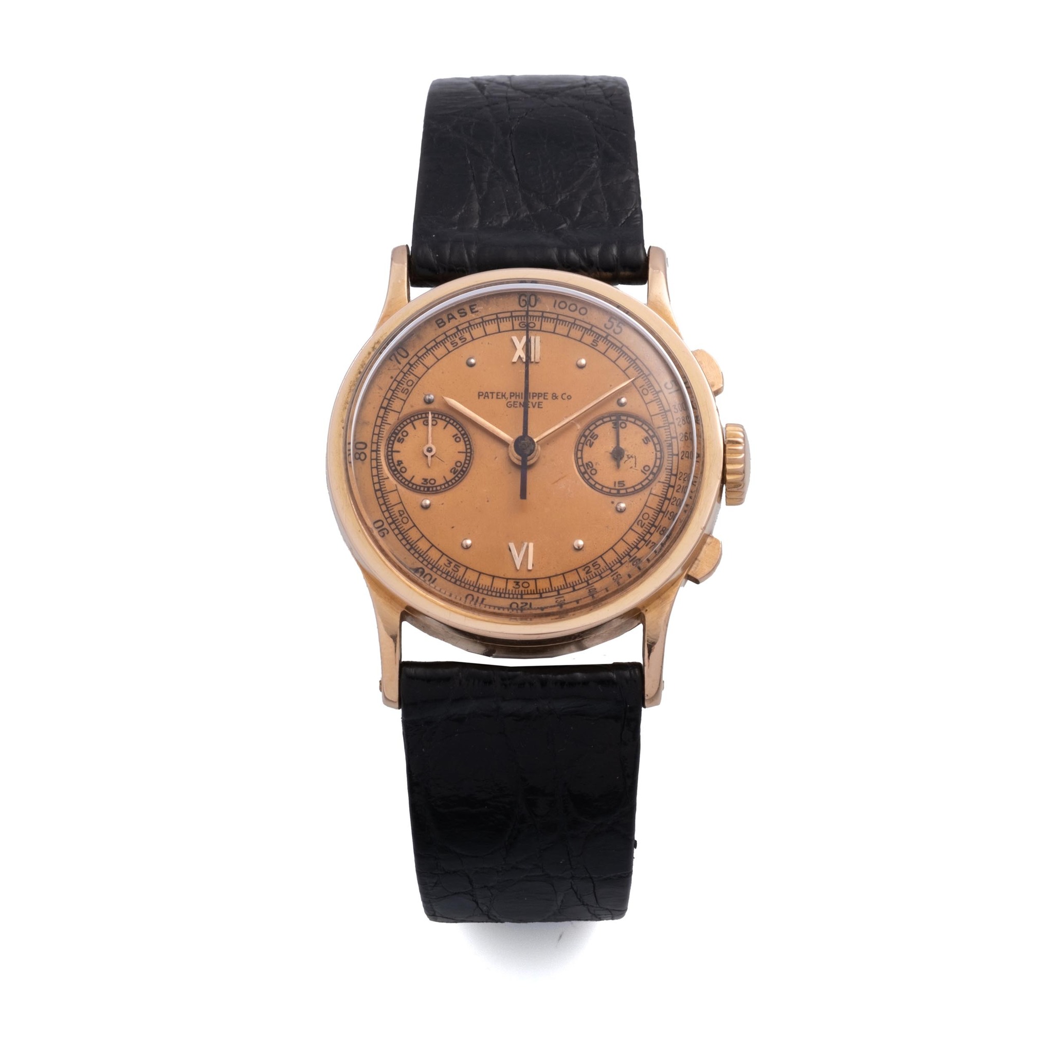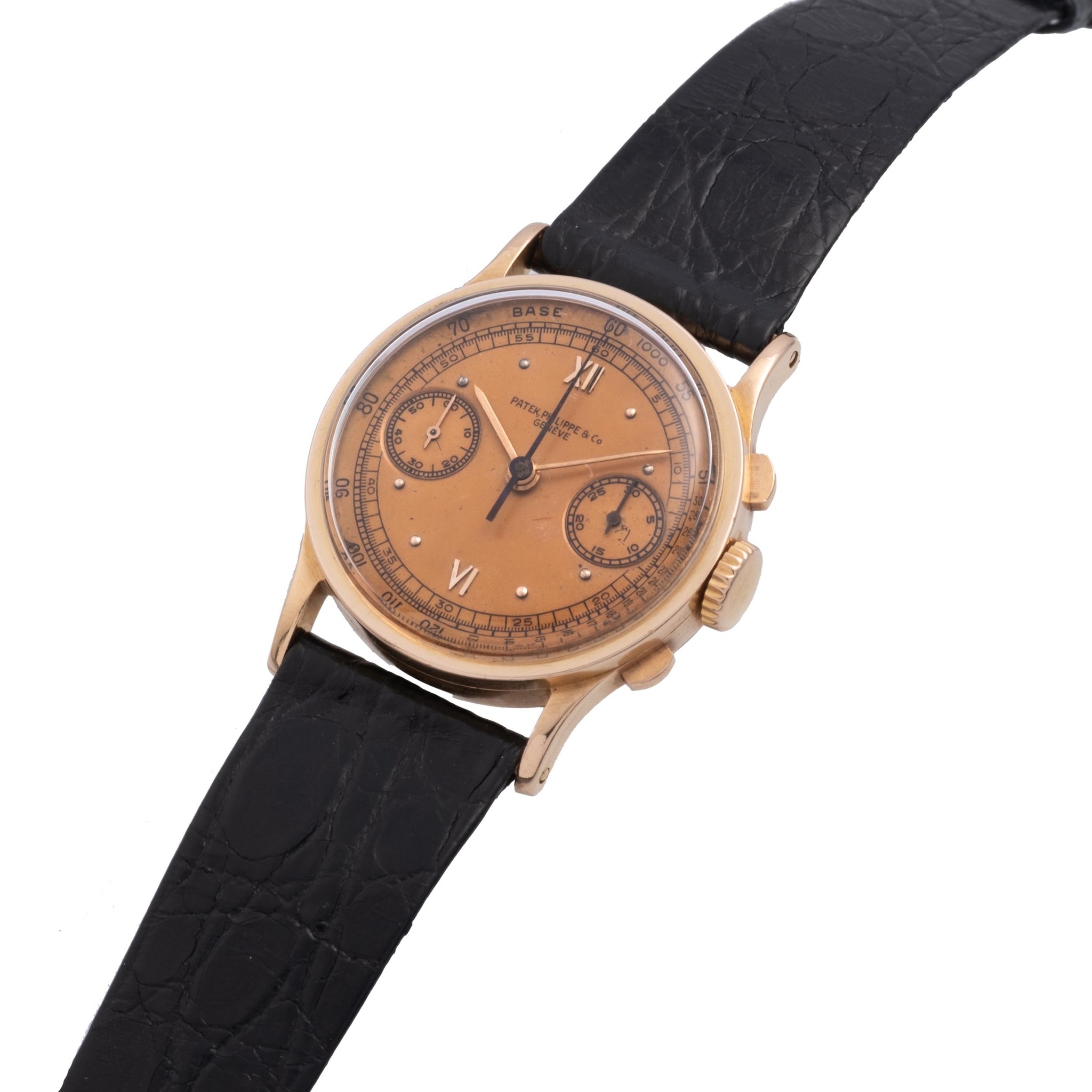 A fine, very rare, 18k pink gold, manual wind chronograph wristwatch with tachometer scale