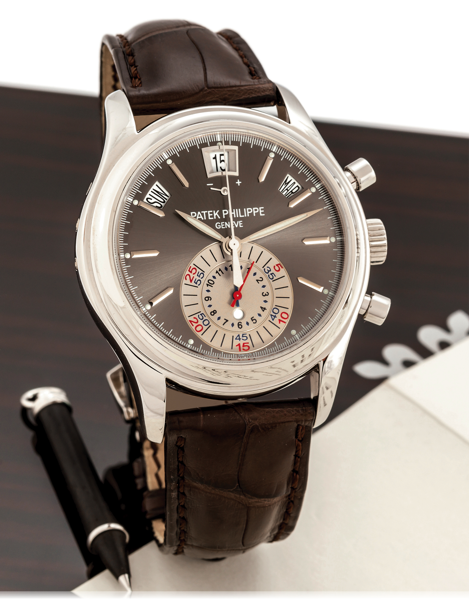 PATEK PHILIPPE REF. 5960 ANNUAL CALENDAR CHRONOGRAPH PLATINUM Patek Philippe, Genève, Annual Calendar Chronograph, No. 3500342, case No. 4374859, Ref. 5960P-001. Sold on March 30th 2007. Very fine, self-winding, water-resistant, platinum with round button Flyback chronograph, combined 30/60- minute and 12-hour totalizer, annual calendar, power reserve, day/night indications and a platinum Patek Philippe deployant clasp. Accompanied by the original fitted box, Certificate of Origin, instruction booklet, booklets and setting pin.
