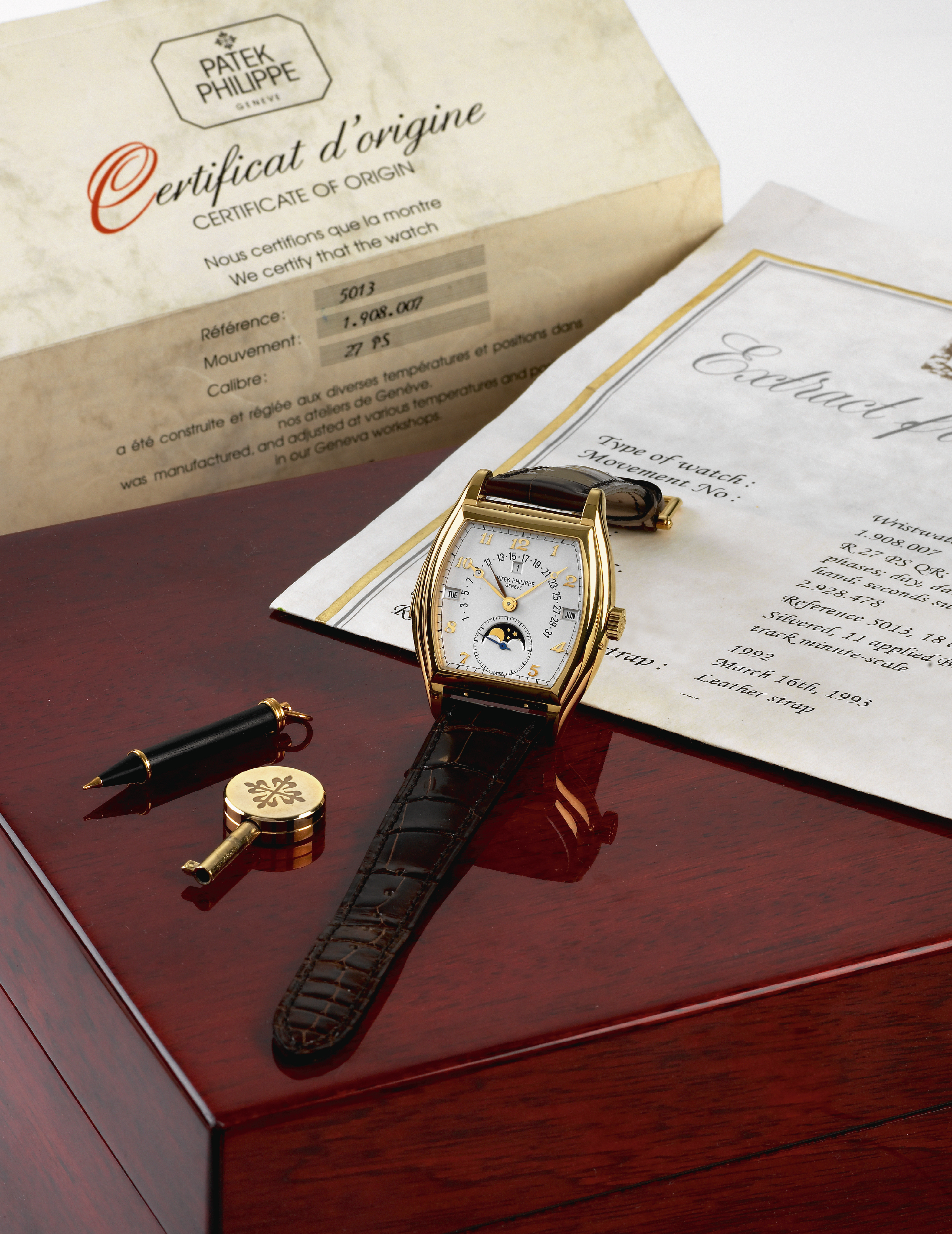 Yellow Gold Ref. 5013 Patek Philippe, Genève, No. 1908007, case No. 2928478, Ref. 5013. Made in 1992, sold March 16th, 1993. Very fine and important, tonneau-shaped, minute-repeating, astronomic, self-winding, 18K yellow gold wristwatch with perpetual calendar and moon phases, retrograde date, leap year display and an 18K yellow gold Patek Philippe buckle. Accompanied by the original mahogany box, Certificate of Origin, Extract from the Archives, setting pin and instruction booklet.