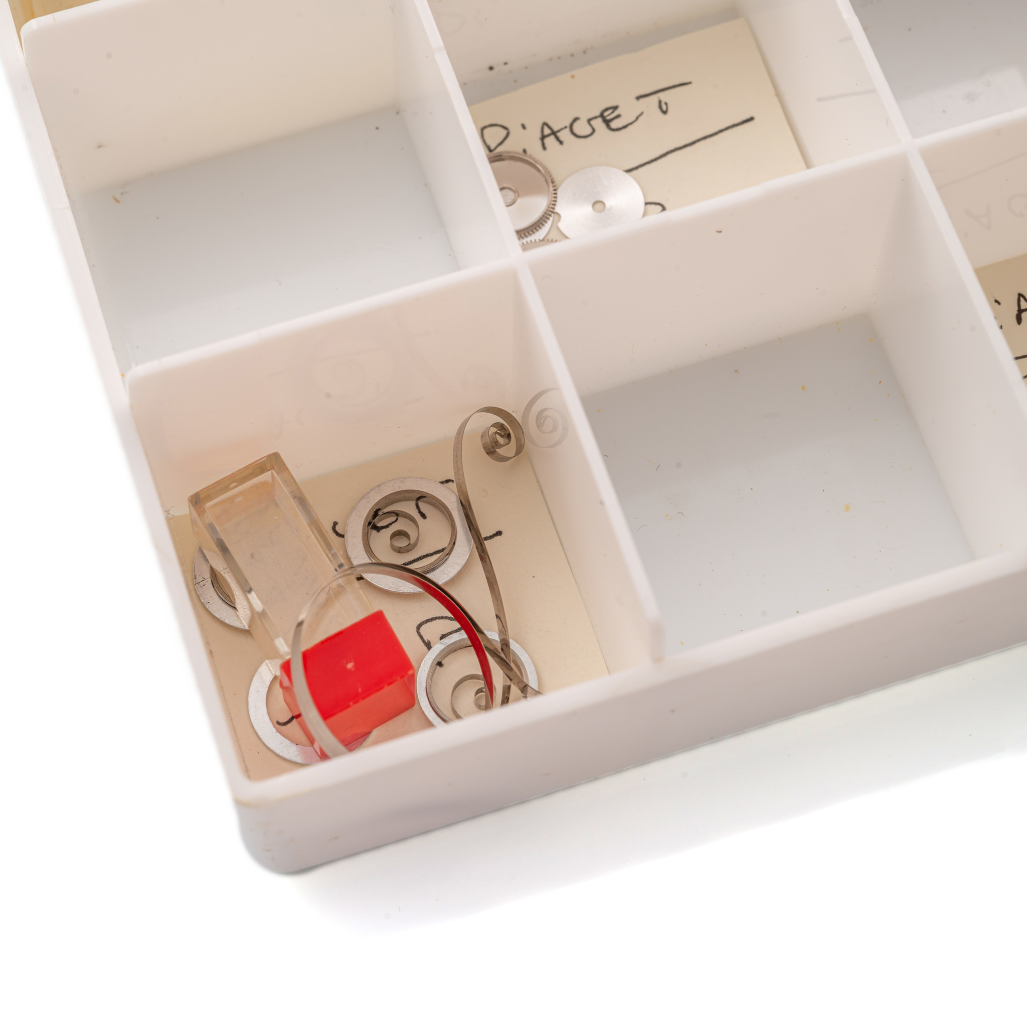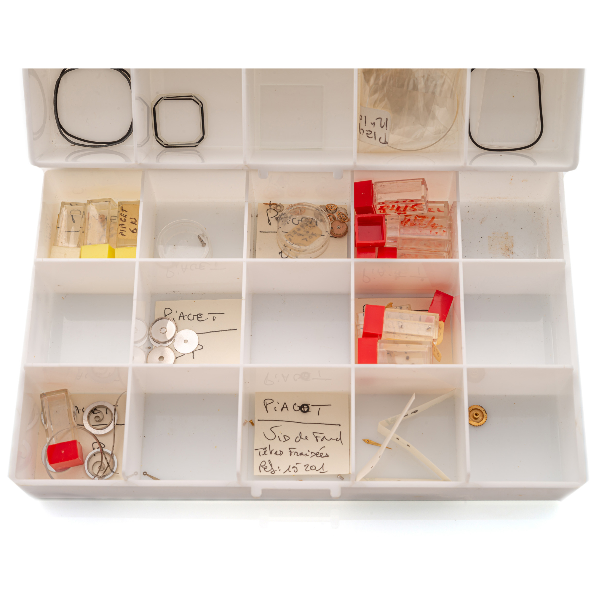 Unusual lot of several spare parts for Piaget watch cases and movements, Caliber 6N, 6P, 9P, 12P, including some rubbers and glasses