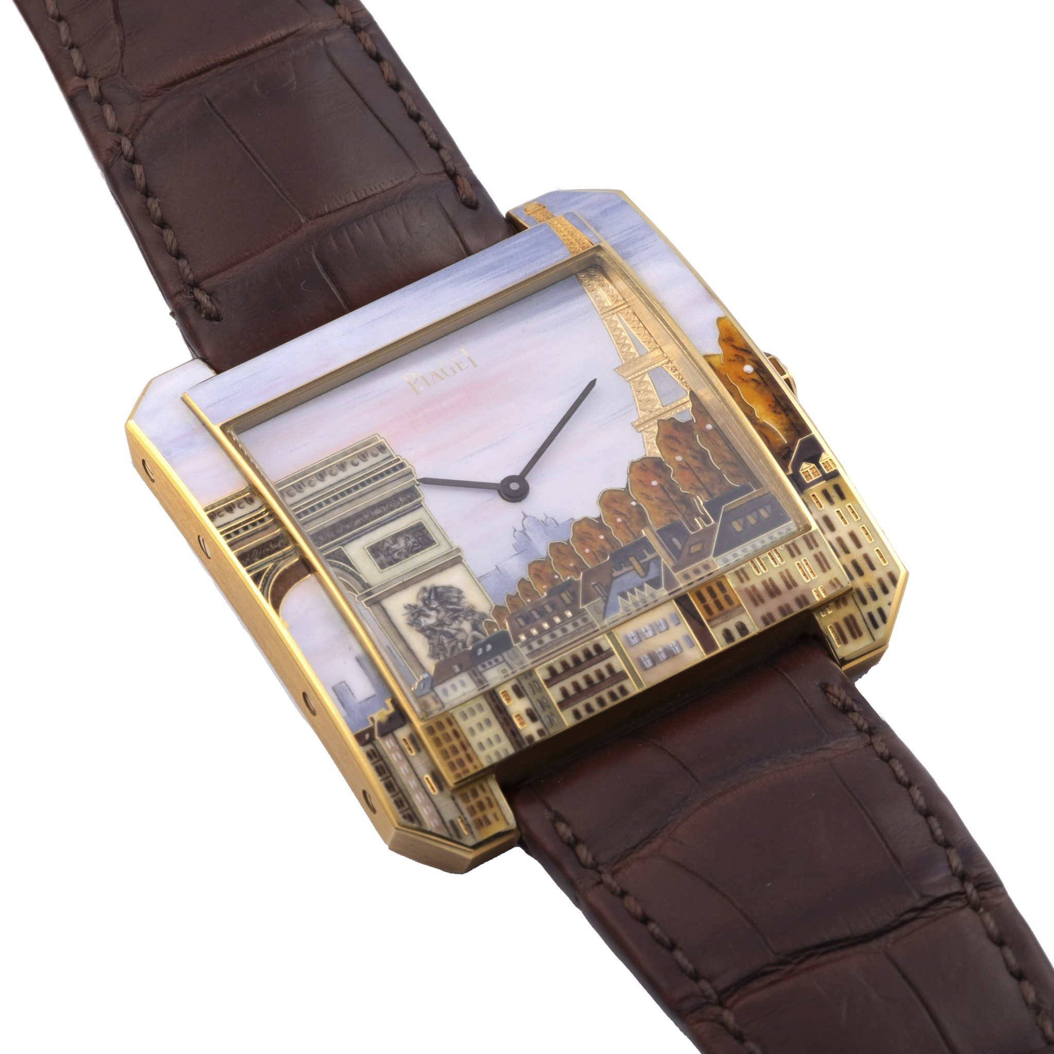 A true work of horological art, this Piaget Pièce Unique stands at the crossroads of haute horlogerie and the centuries-old tradition of cloisonné enameling. The generous 18K yellow gold case provides the perfect frame for a dial crafted entirely by hand, each cloison of gold wire meticulously shaped to outline the architectural poetry of Paris, then filled with layers of enamel fired repeatedly to achieve luminous depth and vivid color.