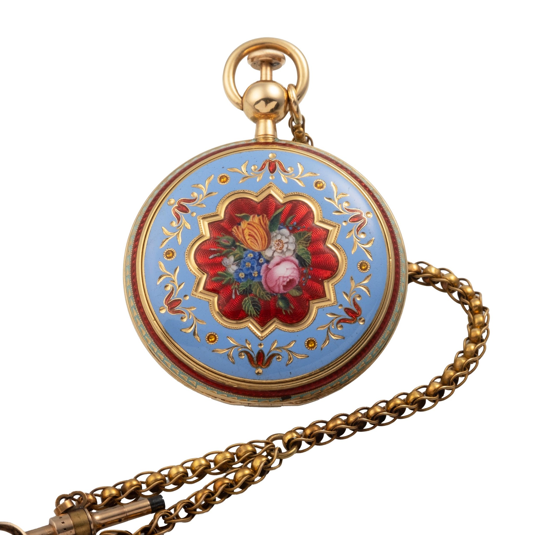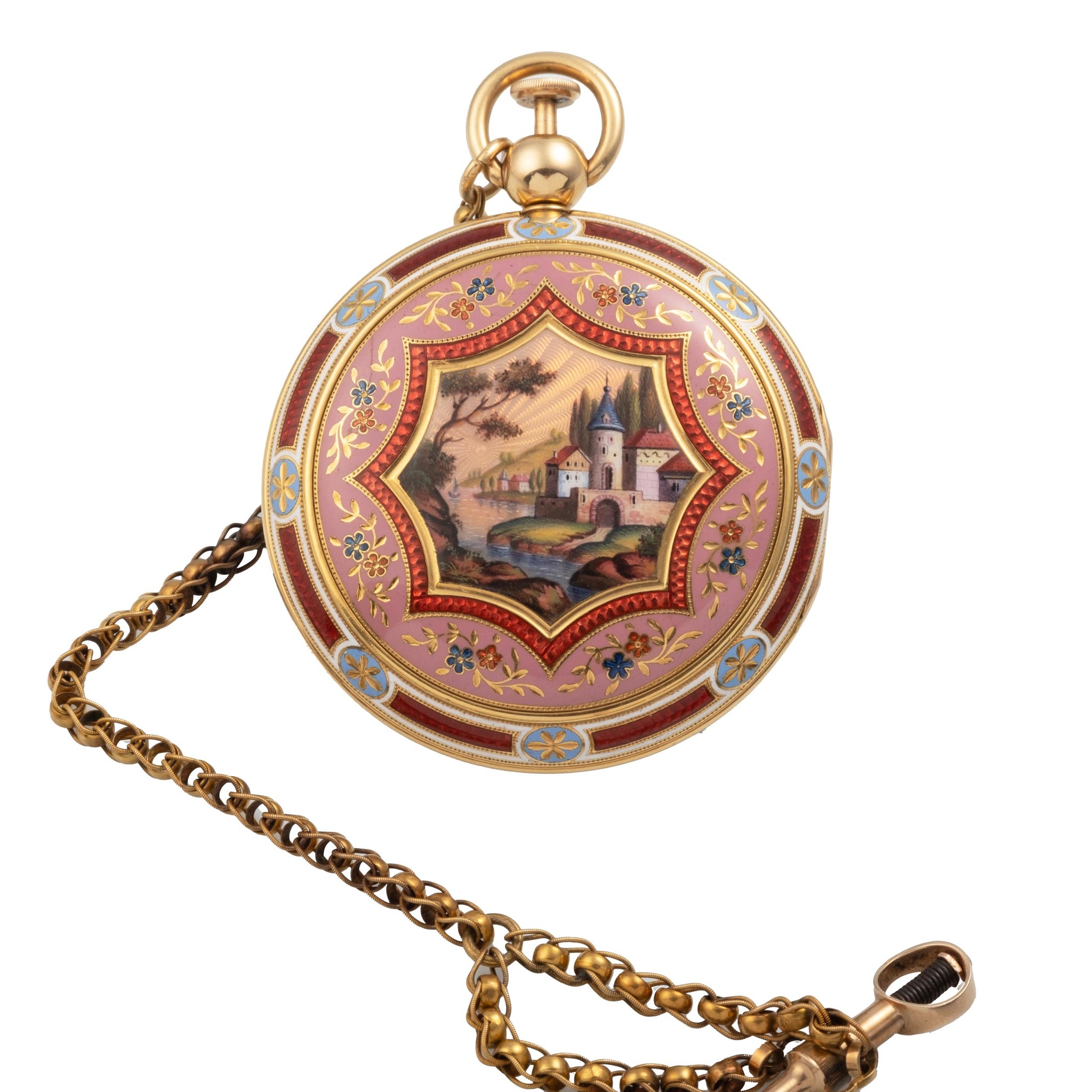 A very fine and rare, 18k gold and painted on enamel, manual wind "cabriolet" quarter-repeating watch in the Breguet style, with ruby cylinder escapement pocket watch. Case back painted on enamel depicting in the centeral medaillon a medieval castle on the right with a large round tower and a brick roof, and an arched bridge spanning the river. Next to it, a small white house with red tile roofs completes the picture. On the left, more small houses can be seen, and in the distance, a sailboat sails peacefully on the lake. The bright, clear sky is accentuated by mountains in the background and a grove of trees to the right. The central painting is framed by a vibrant pink and red motif, adorned with thin gold lines and delicate flowers painted in blue and orange. An outer ring of white and blue completes the design, adding a touch of sophistication. Inner case, with center with painted on enamel bouquet of flowers against translucent scarlet enamel over flinqué, border in light blue enamel with stylized gold foliage, bezels en suite to the outer case bezel.