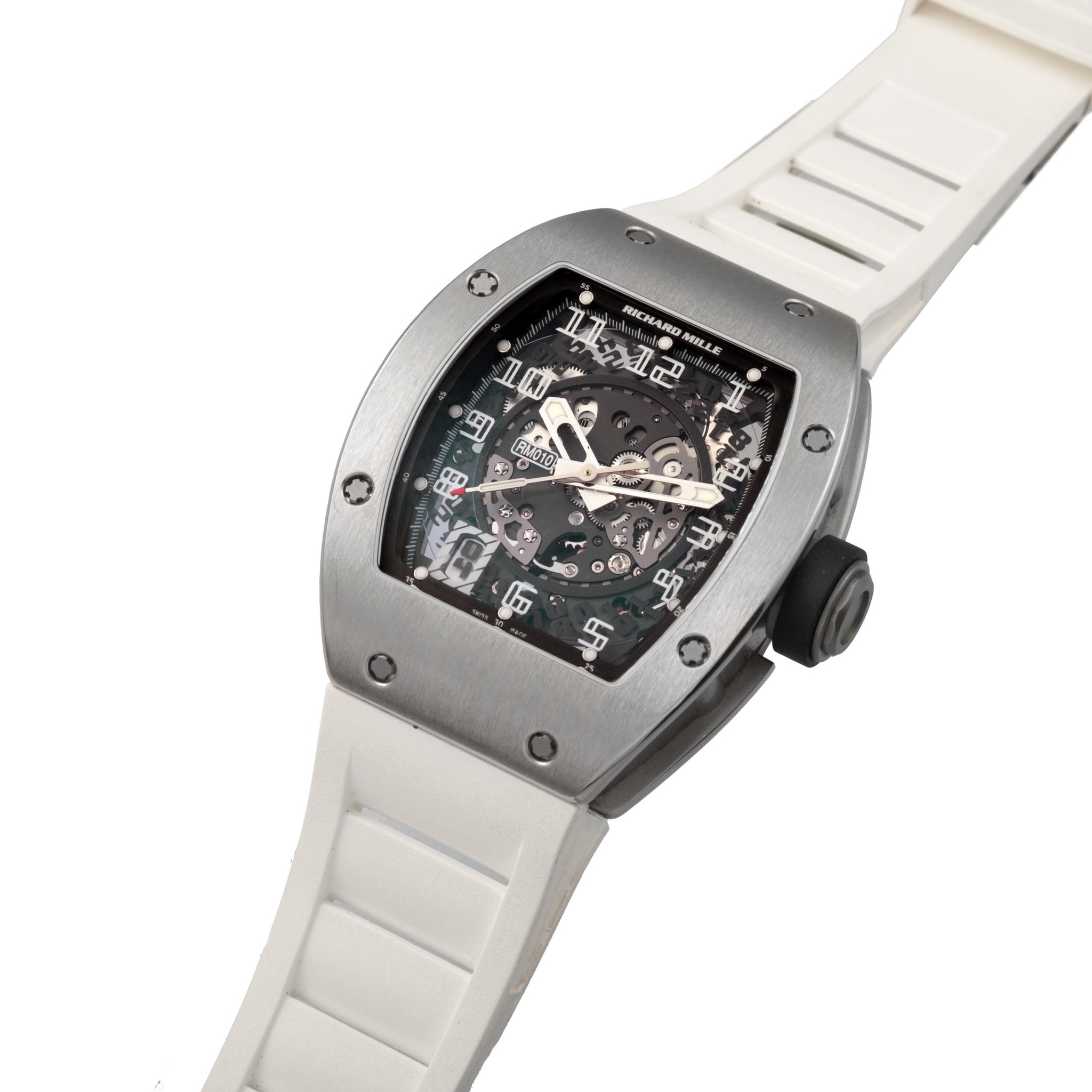 The present Richard Mille RM010 in white gold is an outstanding example of the model that helped define the brand’s modern architectural identity. Introduced as one of the earliest references to establish the signature tonneau case, skeletonized movement and three-dimensional dial construction, the RM010 quickly became emblematic of Richard Mille’s fusion of high horology and avant-garde engineering. Crafted in solid white gold, the case displays the complex geometry and meticulous brushing that have positioned the brand among the most technically sophisticated case manufacturers in contemporary watchmaking.
