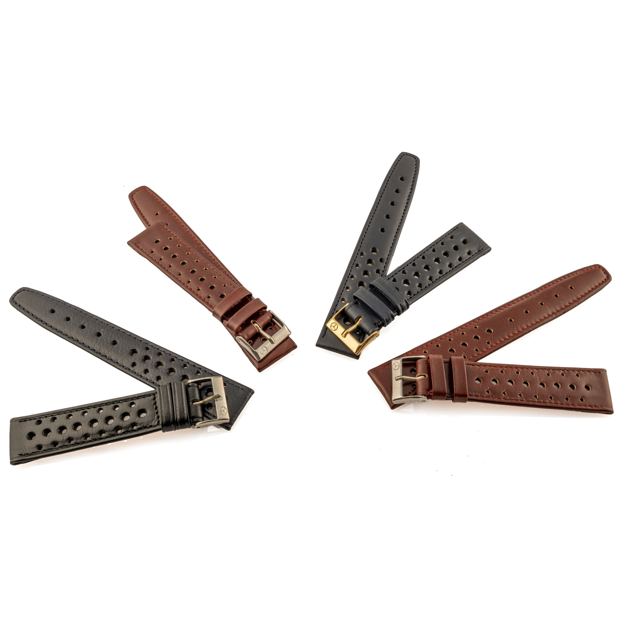 A lot of four leather straps for wristwatches with stainless steel and gilded metal buckles: