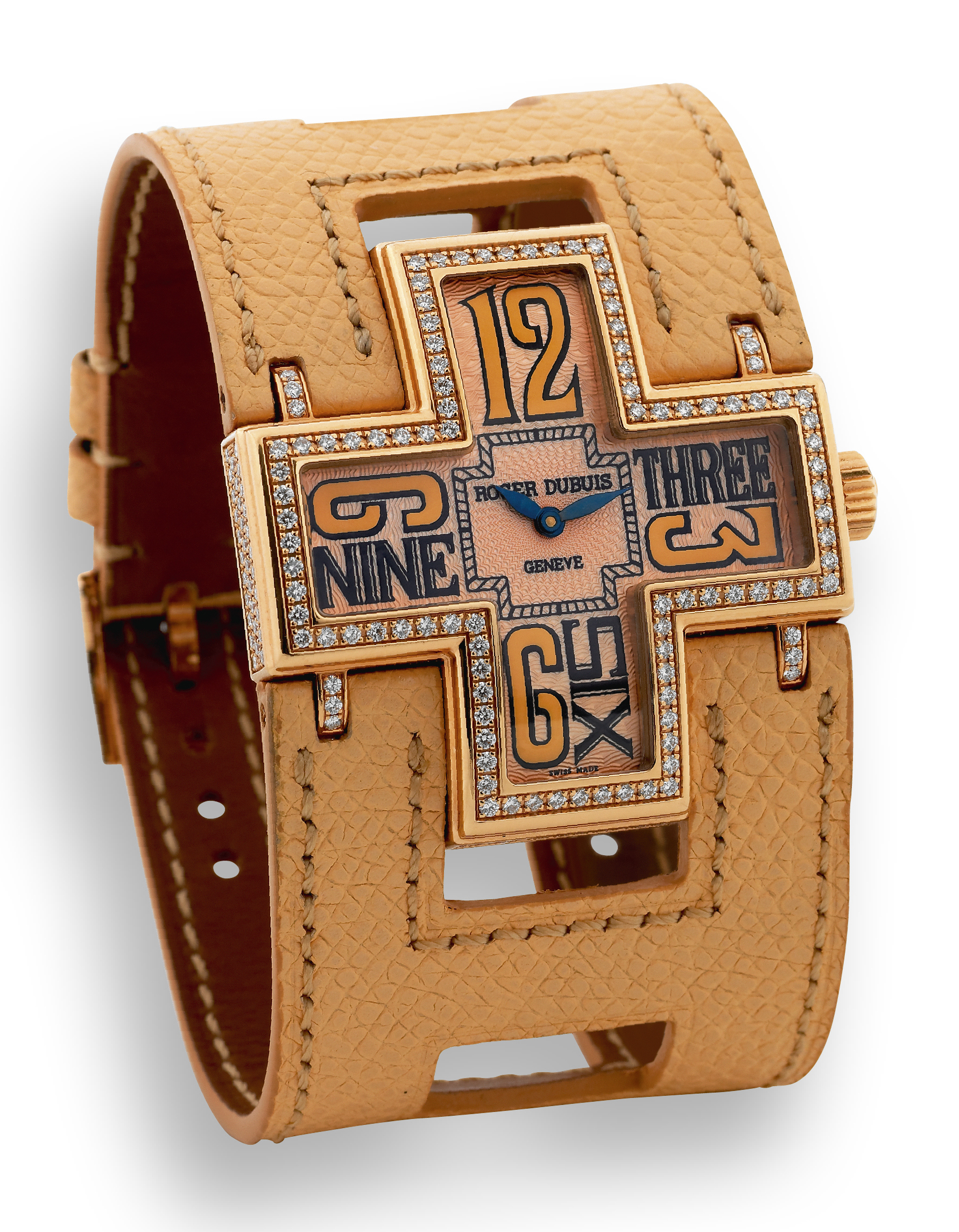 Pink ?Follow Me? Roger Dubuis, Horloger Genevois, "Follow Me," No. 217/888, Ref. F17. Made in a limited edition of 888 pieces in the early 2000s. Fine and unusual, cross-shaped and curved, water-resistant, 18K pink gold and diamond quartz wristwatch with an 18K pink gold matching Roger Dubuis double buckle, set with 50 round brilliant-cut diamonds. Accompanied by a fitted box, certificate and a spare brown strap.