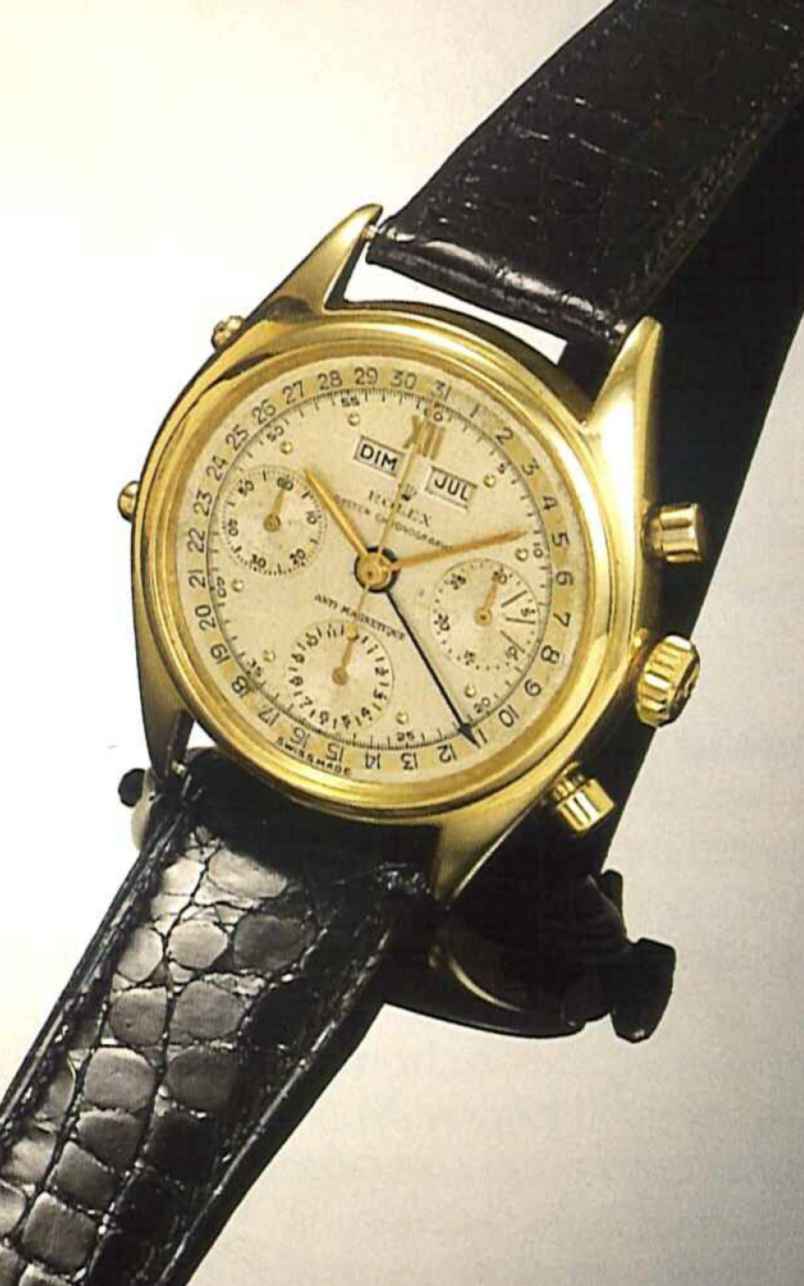 Rolex Oyster Chronograph, "Anti-Magnétique", Ref. 4767, 1960 's. Very fine tonneau shaped, waterproof, 18 ct. gold gentleman's wristwatch with round button chronograph, registers and triple date.