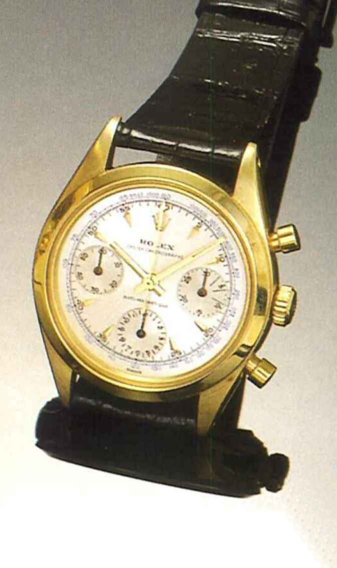 Rolex Chronograph "Anti-Magnétique", Ref. 6238, produced in 3600 examples from 1962 to 1967. Very fine tonneau shaped, waterproof, 18 ct. gold gentleman's wristwatch with round button chronograph, registers and tachometer.