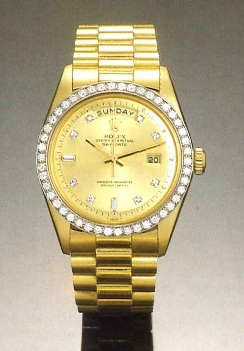 Rolex Oyster Perpetual "Day-Date", Superlative Chronometer Officially Certified, Ref. 1803, 1970's. Very fine waterproof, centre second, selfwinding, 18 ct. gold and diamonds gentleman's wristwatch with date and 18 ct. gold President bracelet.