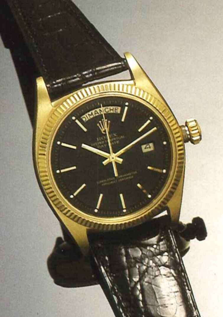 C. massive, polished, satined, screwed back and crown, reeded bezel, "Cyclope" crystal. D. black with applied gold indexes, apertures for the day and the date. "Bâton" radiumed gold hands. M. 12 7I"' rhodiumed, 26 jewels, lever escapement, monometallic balance adjusted to tempera tures and 5 positions, antishock system, selfcompensating Breguet balance-spring. Dial, case and movement signed. In excellent condition. Diam. 36 mm.