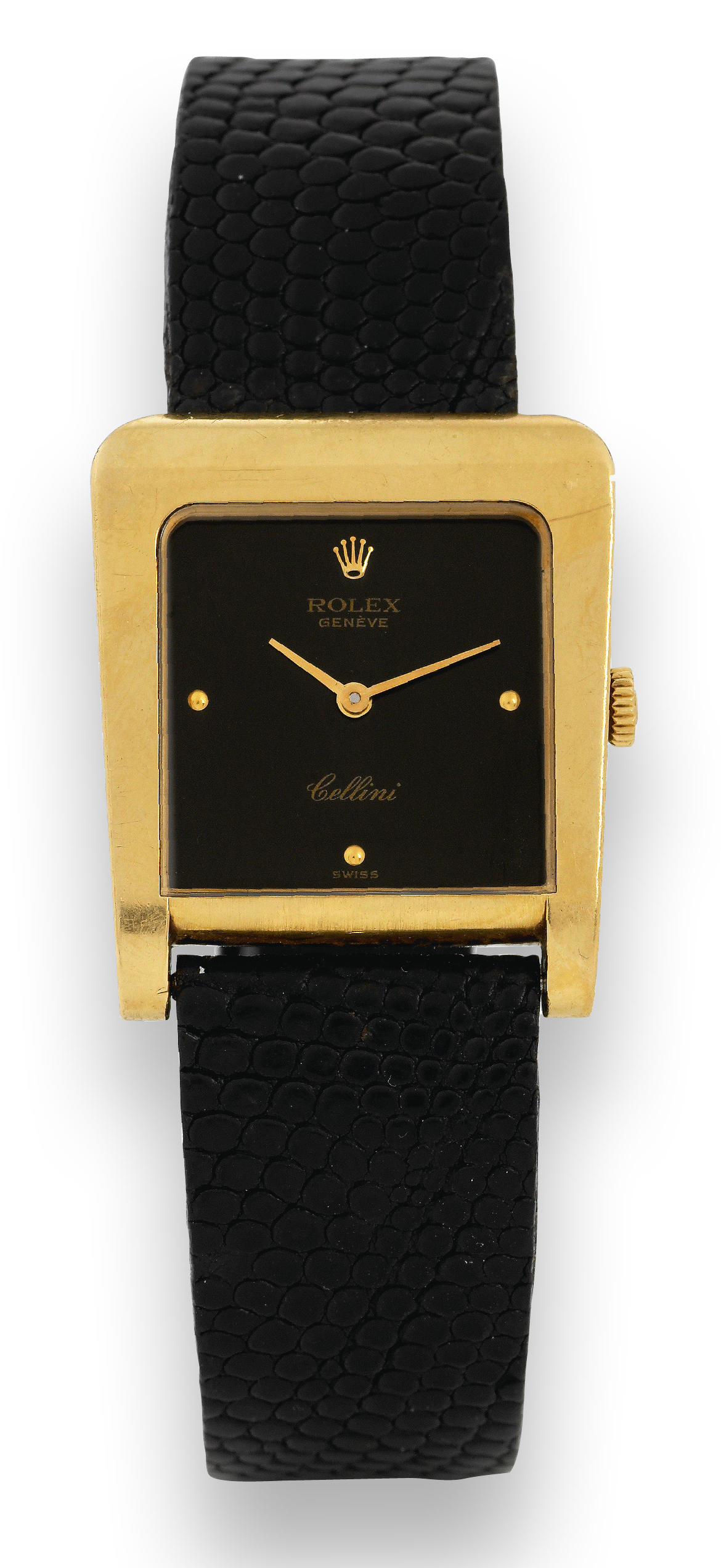 Rolex, Cellini, Ref. 4100. Made in the 1970s. Fine and unusual, asymmetric, trapezoidal, 18K yellow gold lady?s wristwatch with a yellow gold-plated Rolex buckle.