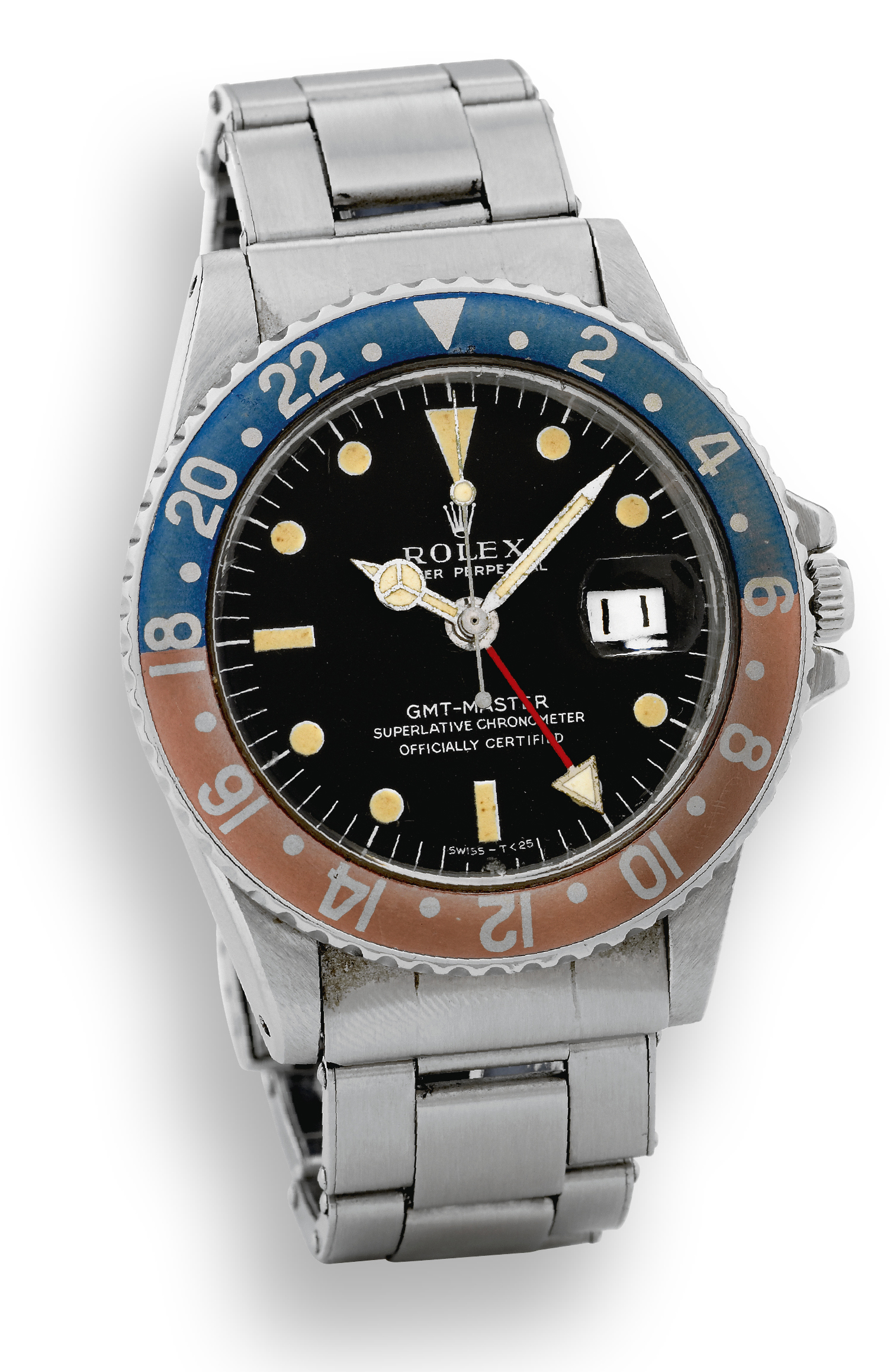 Ref. 1675, GMT-Master Rolex, "Oyster Perpetual, GMT-Master, Superlative Chronometer, Officially Certified,? Ref. 1675. Made in 1971. Fine, two time zone, center seconds, self-winding, waterresistant, stainless steel wristwatch with date, special 24-hour bezel and hand and a stainless steel Rolex Oyster bracelet. Accompanied by 2 extra links.