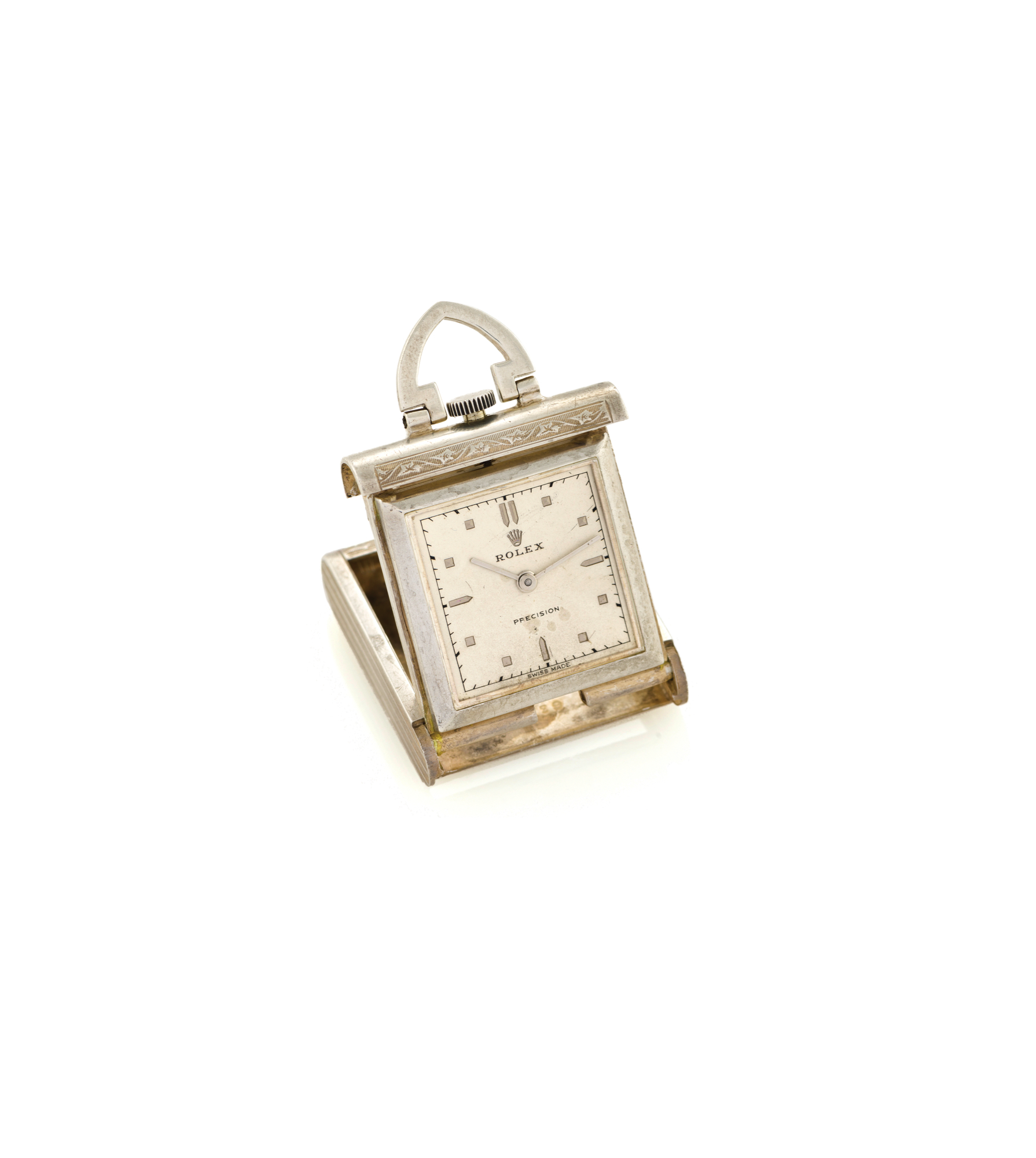 ROLEX SILVER PURSE WATCH Rolex, Geneve, 'Precision', case No. 63557. The case with Glasgow import marks for 1928-1929. An unusual and rare sterling silver purse watch with concealed dial opening as a desk timepiece.