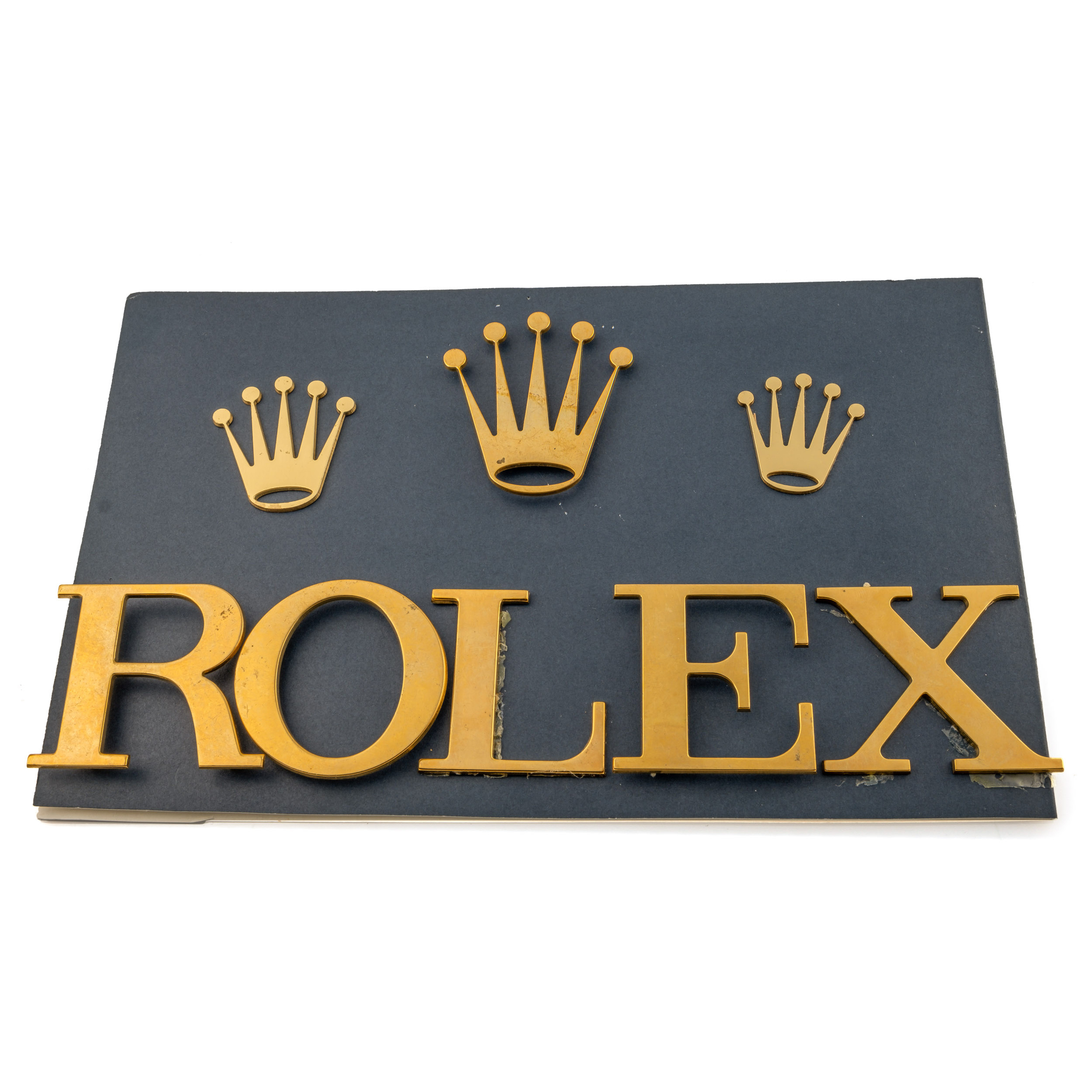 A set of five gilt brass letters forming the name “ROLEX”, with three crowns, emblem of the Genevan manufacture; promotional material.