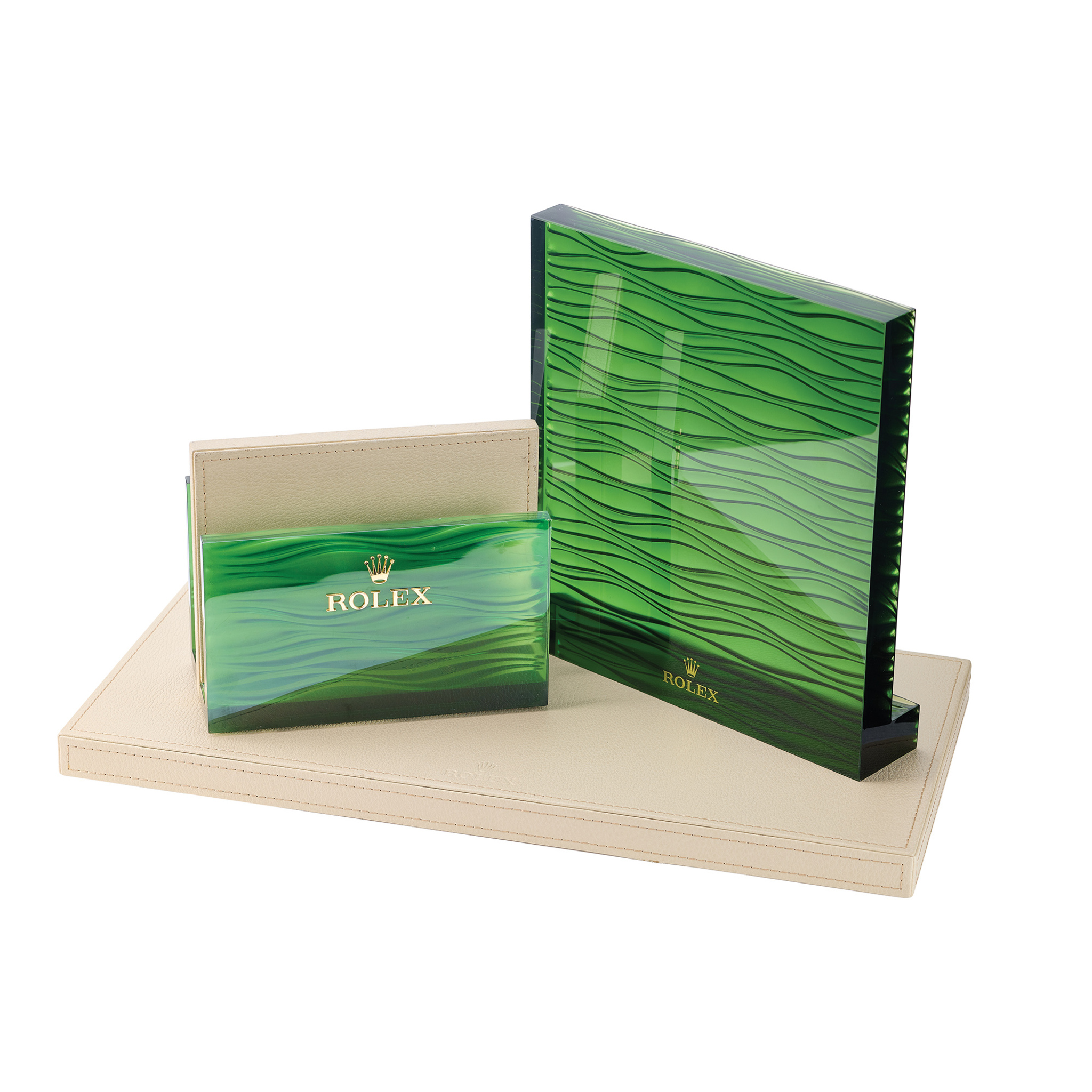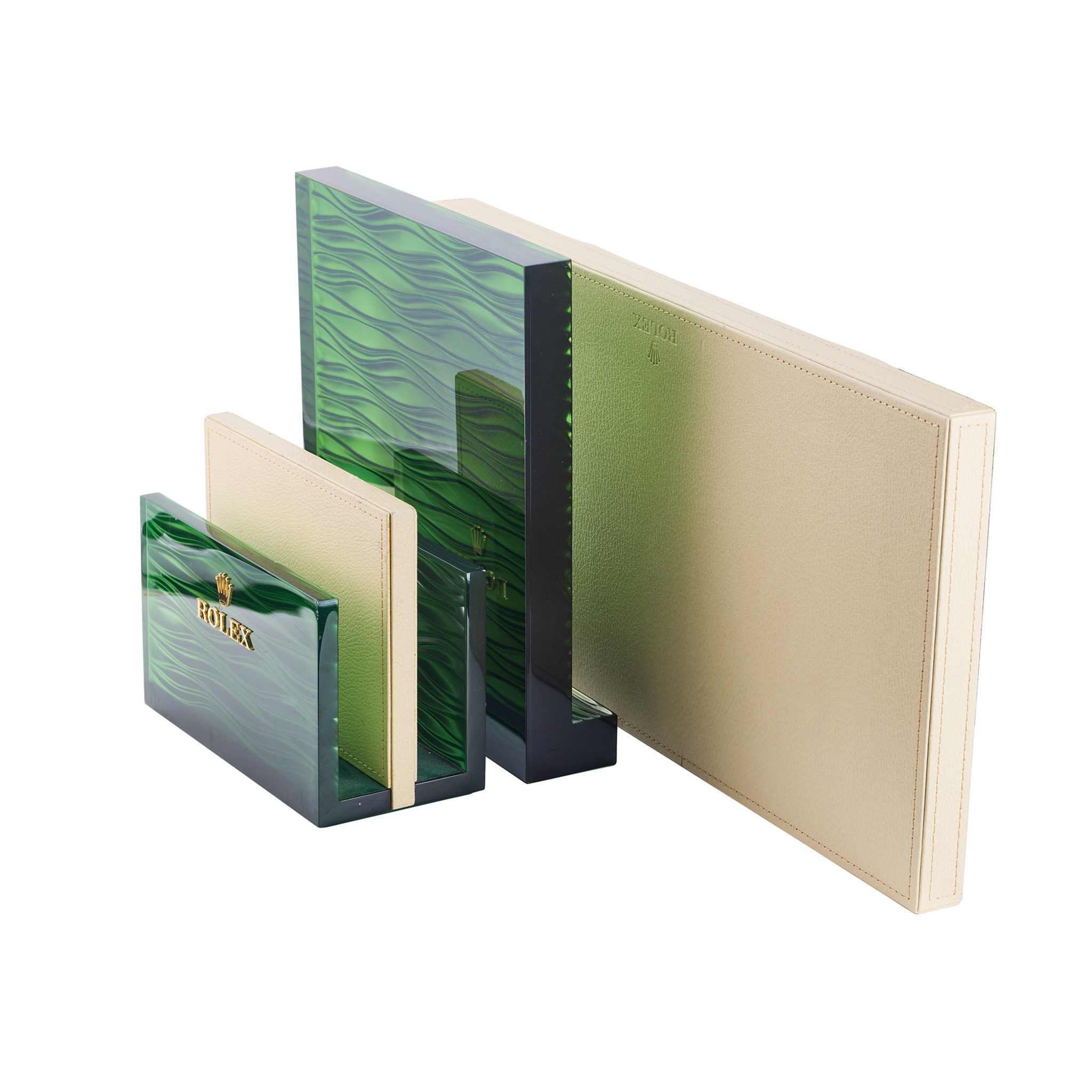 A fine and unusual set of three retail display items designed for showcasing magazines, books, and watches.a leather and green-plastic magazine/book holder with a metal rolex logo, a green plastic display stand, and a leather watch display panel. made for retailers.