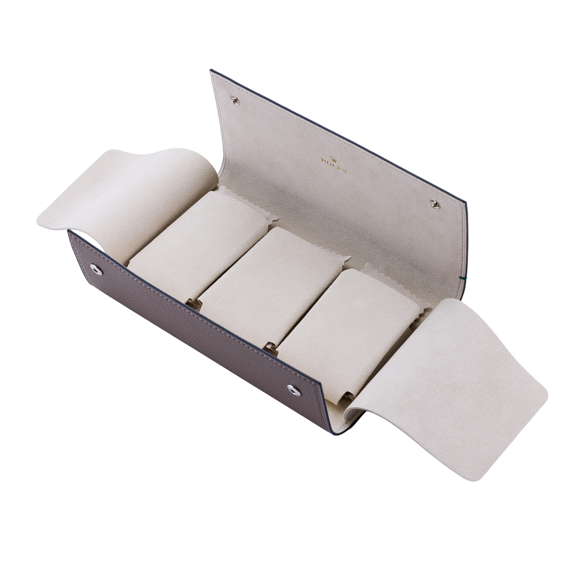 A fine rolex vip gift, a leather trio watch travel pouch featuring suede interior.