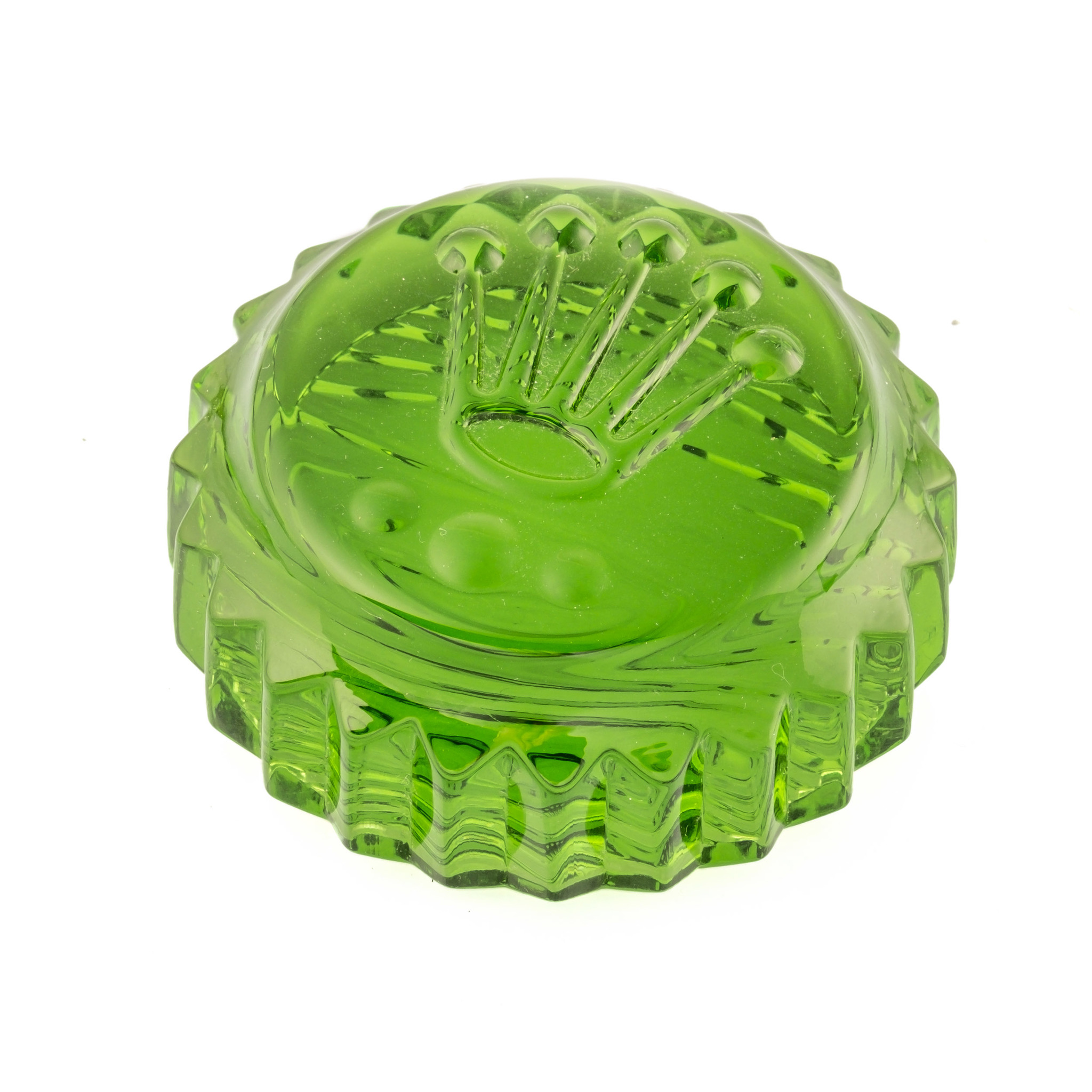 A green tinted moulded glass, paper-weight, in the shape of an “Oyster” “Triplock” winding-crown with the Rolex “Crown” logo.