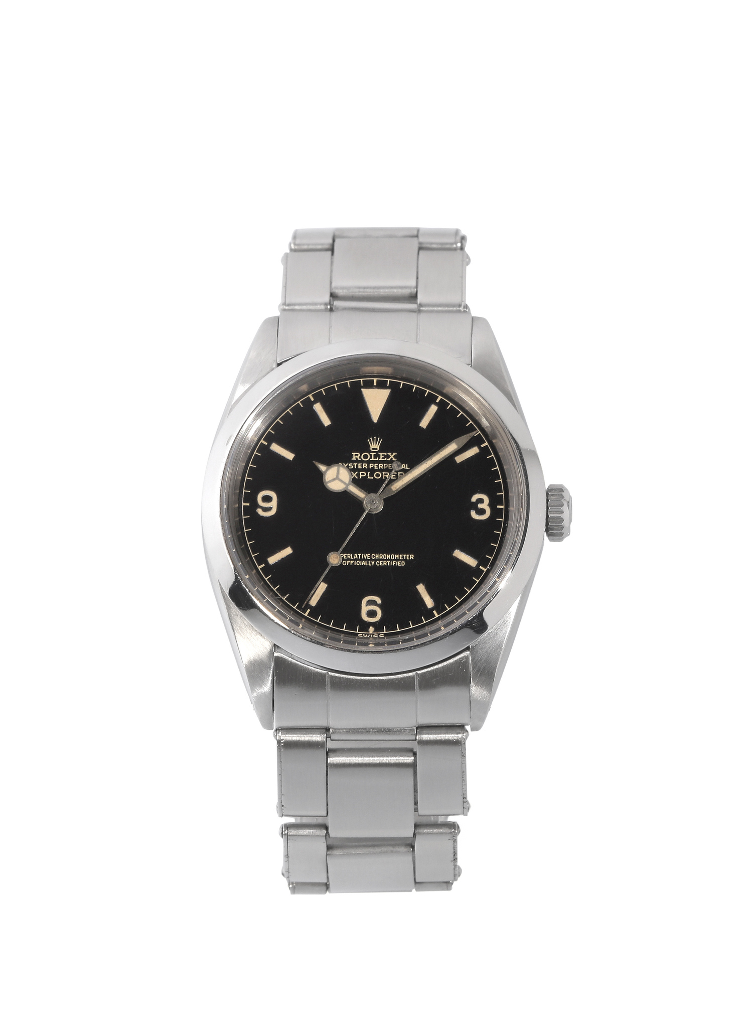 A rare and exceptionally charismatic Explorer I, uniting a glossy gilt chapter-ring dial and a beautiful tritium patina, a highly collectible configuration that embodies the golden era of Rolex tool-watch innovation. A significant and deeply attractive piece for the discerning connoisseur.
