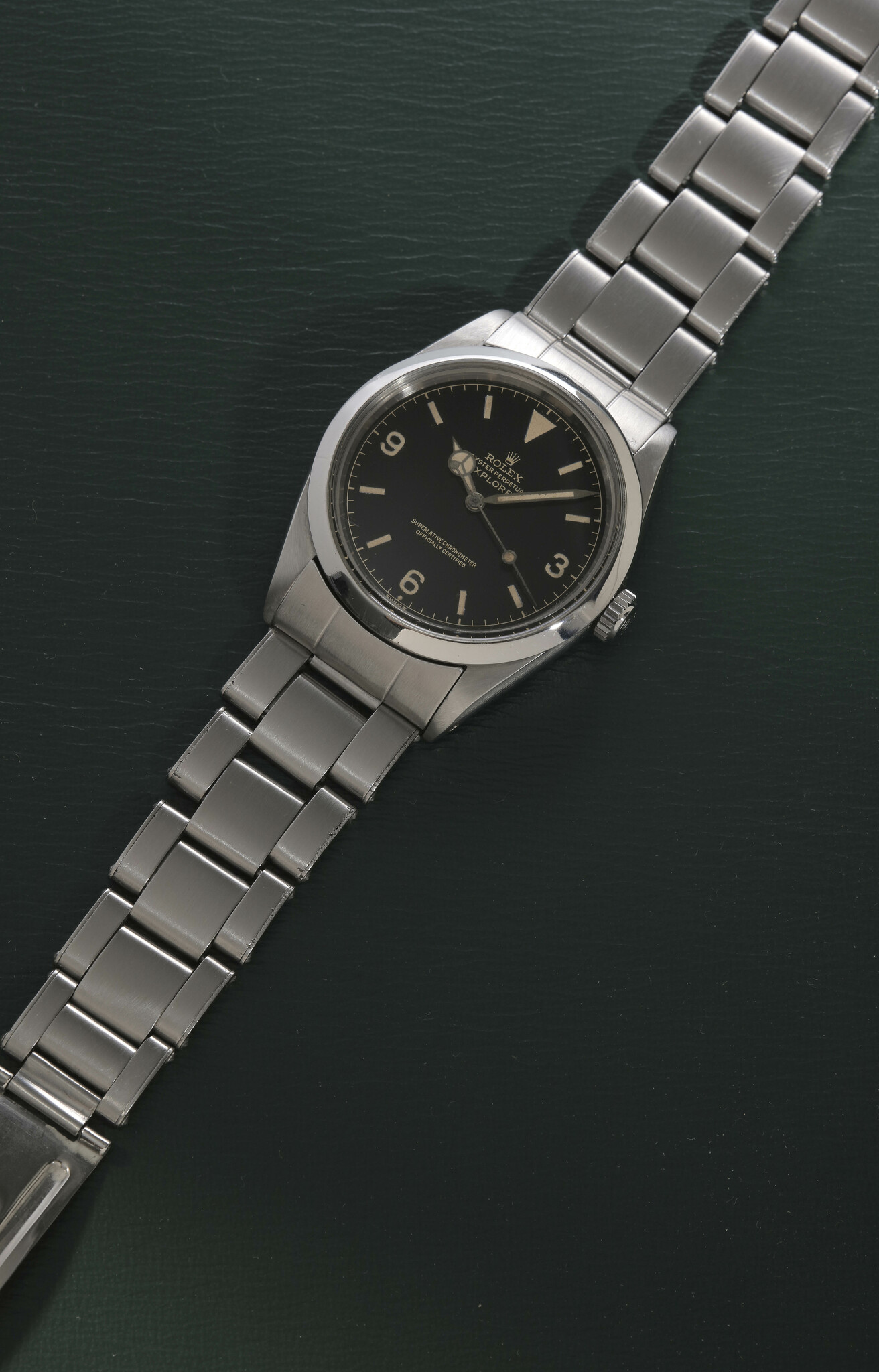 The lacquered gilt exclamation point dial is remarkably well preserved, exhibiting deep gloss and crisp printing with no visible defects to the gilt text. The tritium luminous markers have aged to a stunning pumpkin-colored patina,perfectly matching the hands and enhancing the warm, vintage character of the watch. The iconic 3-6-9 Explorer layoutis showcased at its finest here: pure purpose, absolute clarity, and enduring design beauty.