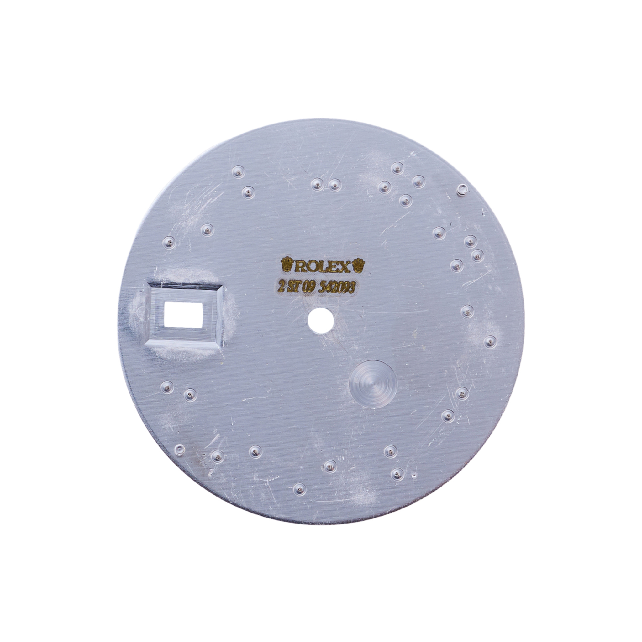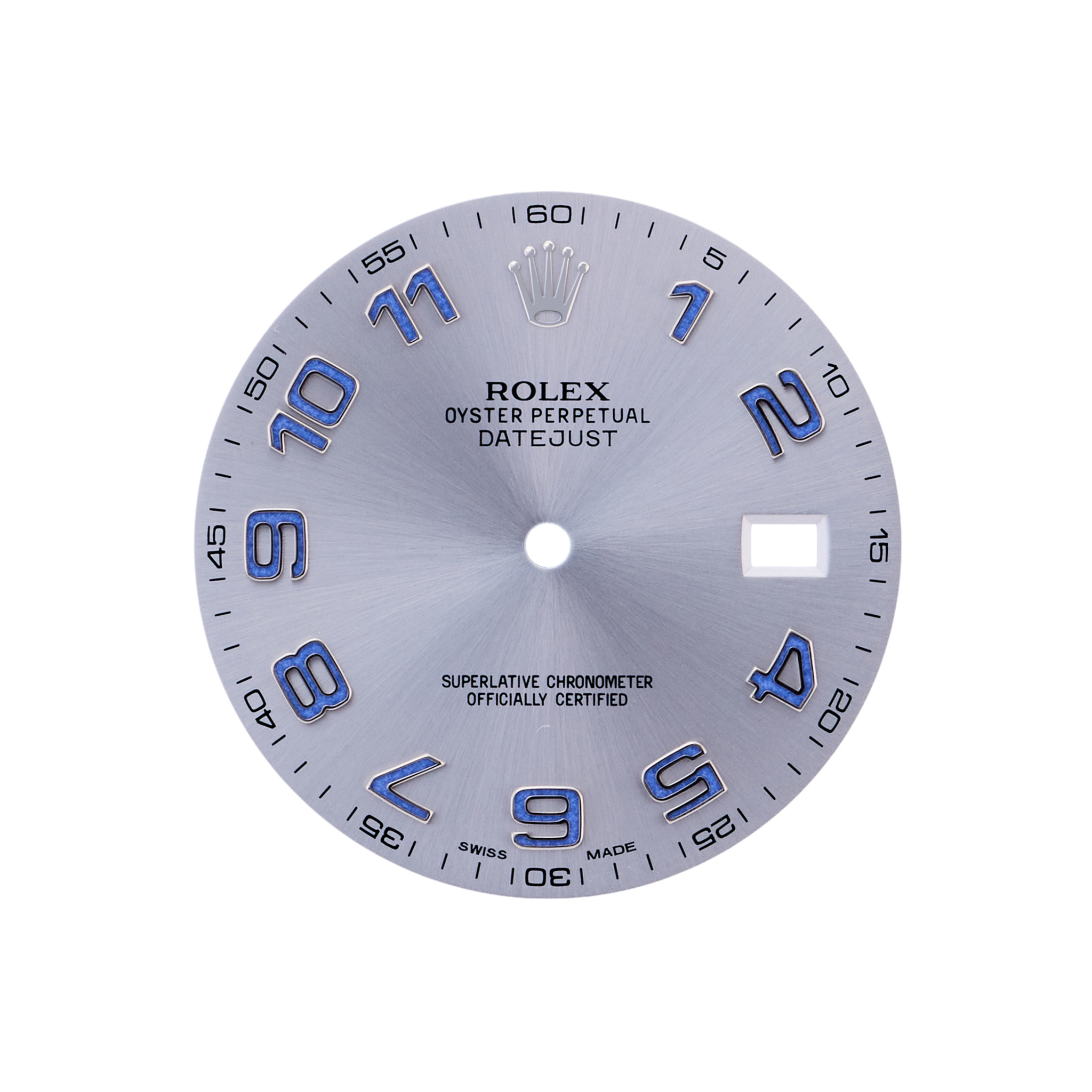 A fine and rare, gilt brass, silver dial with blue arabic numerals index for rolex reference 116300.