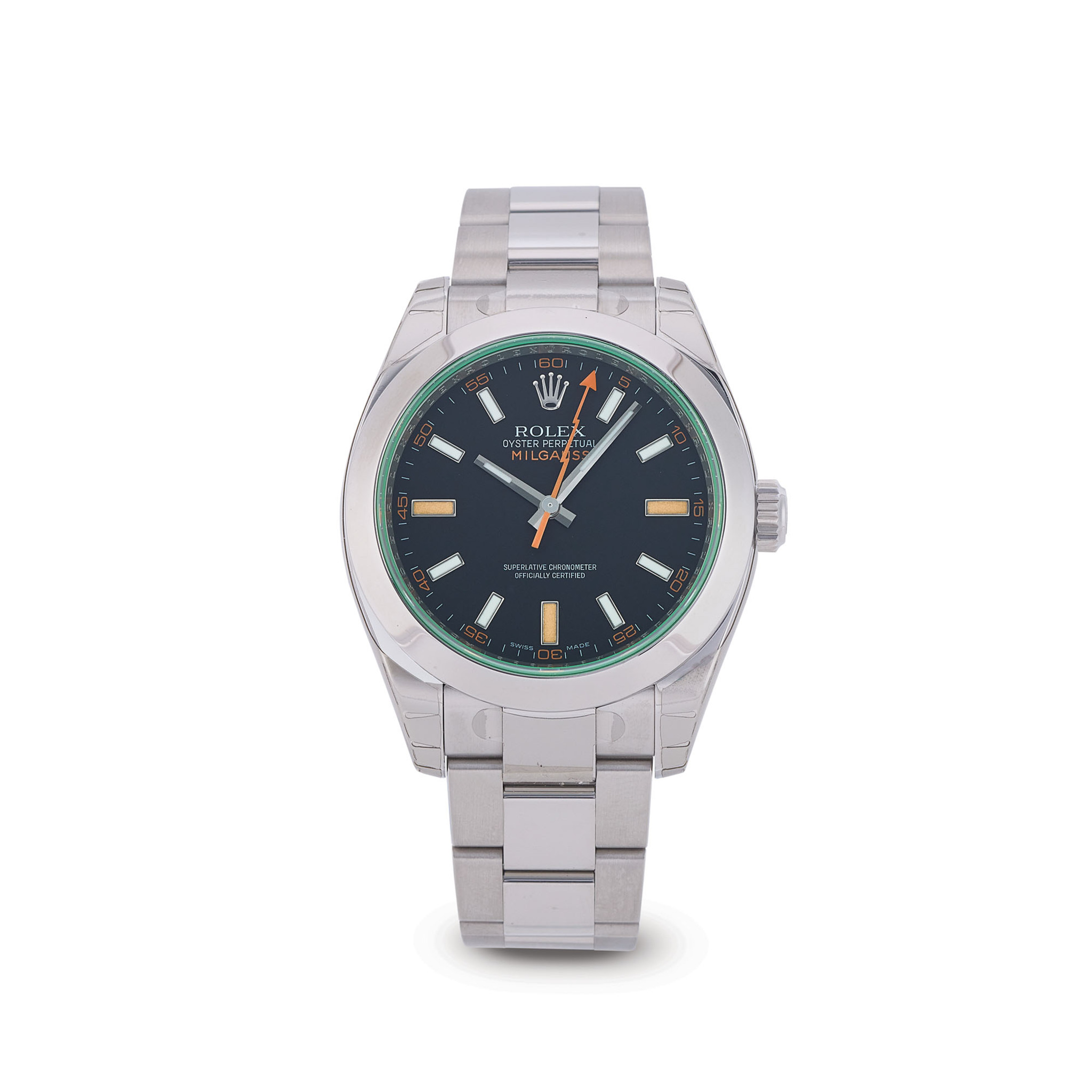 A fine, self-winding, stainless steel wristwatch, anti-magnetic shield to 1000 Gauss, green sapphire crystal black dial and screwed down case back engraved: Rolex Oyster–Milgauss.