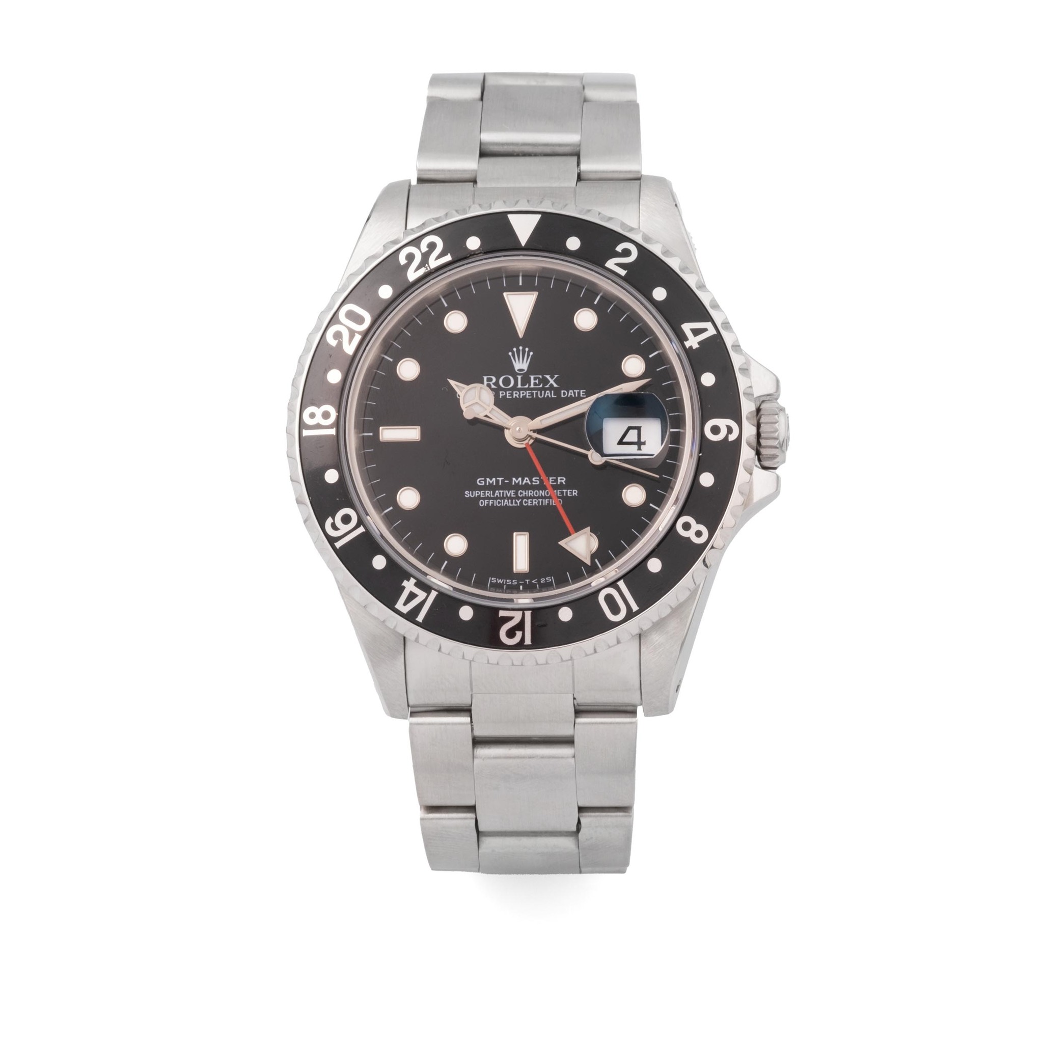 A very fine and iconic, self winding wristwatch with black dial, GMT function