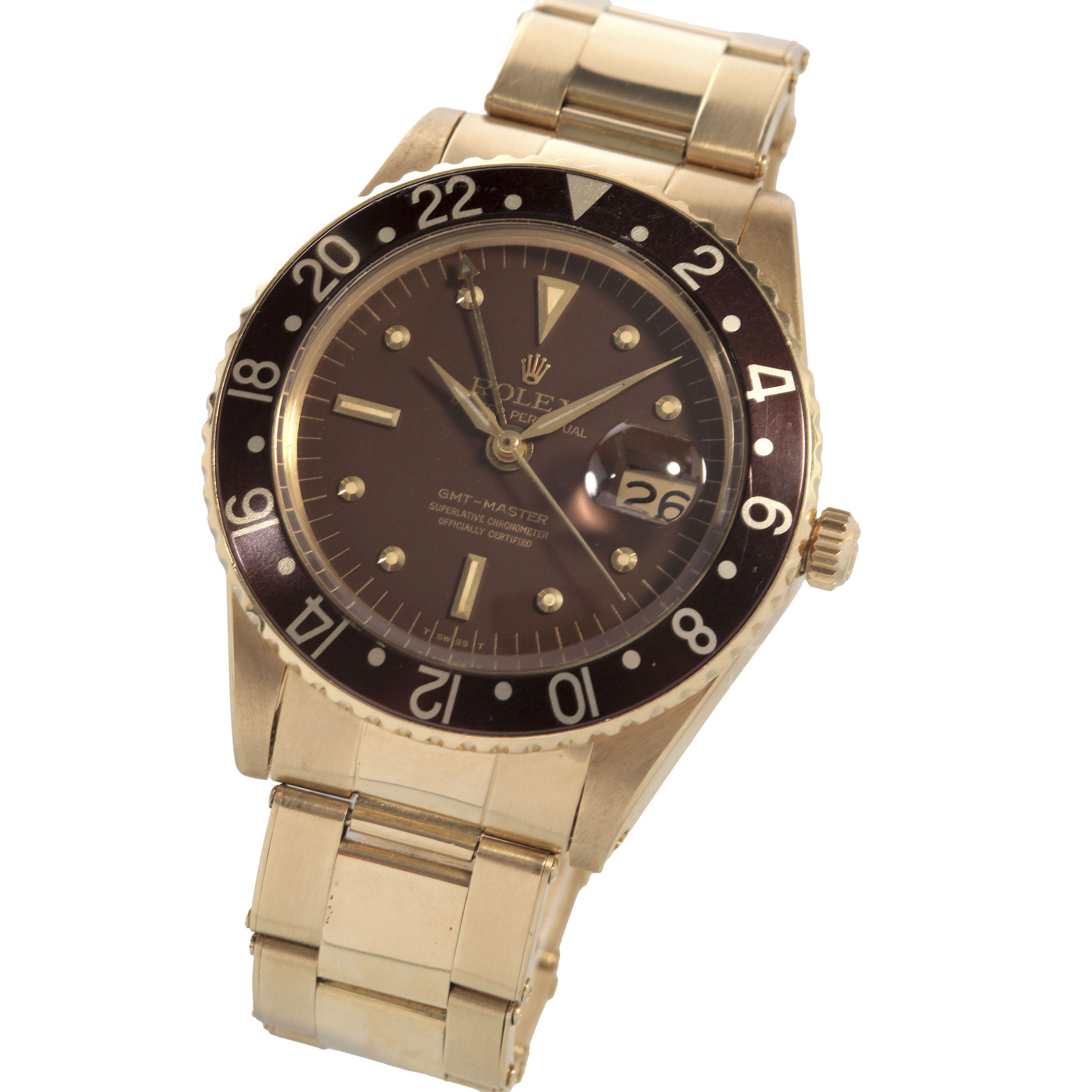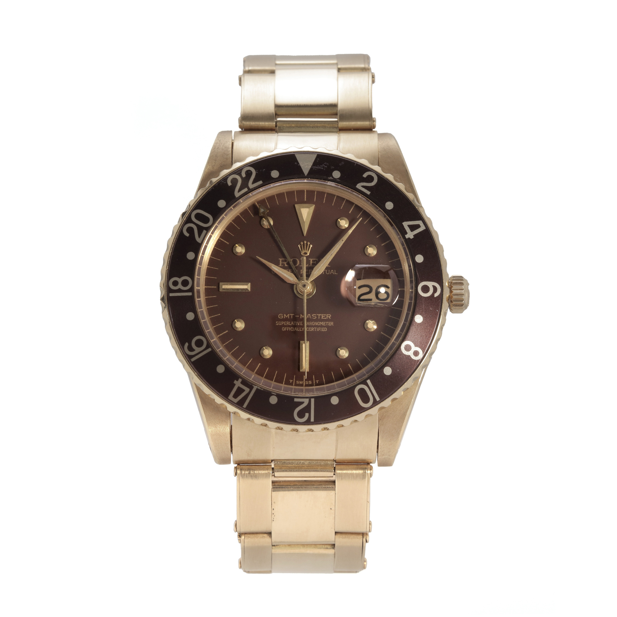 Cased in a warm 18K yellow gold case, this piece exudes vintage sophistication and period-correct elegance. The brown dial displays a rich glossy tone with beautifully aged luminous accents, harmonizing perfectly with the matching brown bezel insert. The combination of the gold case, brown tones, and Alpha hands gives this early GMT-Master an unmistakably refined and distinctive character.