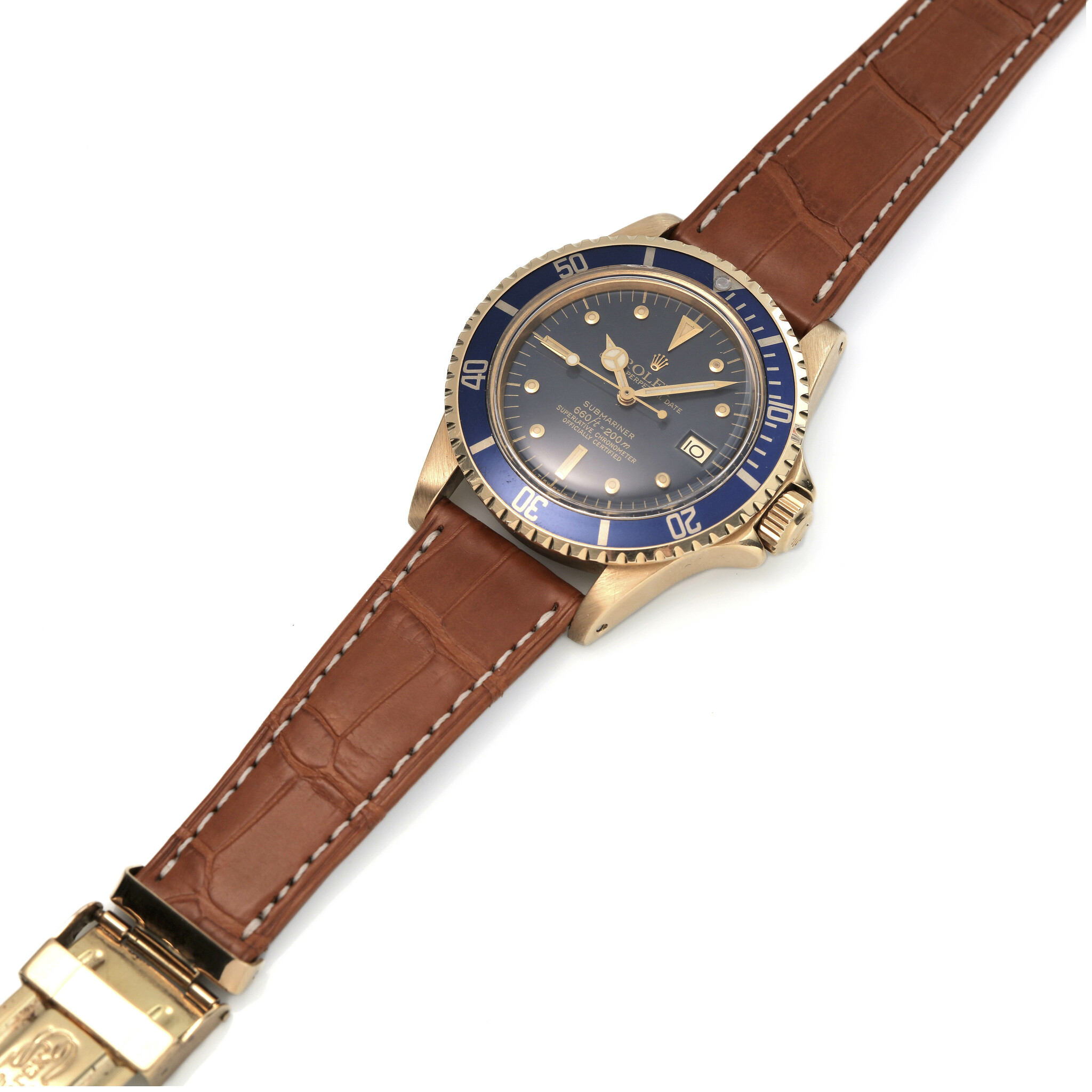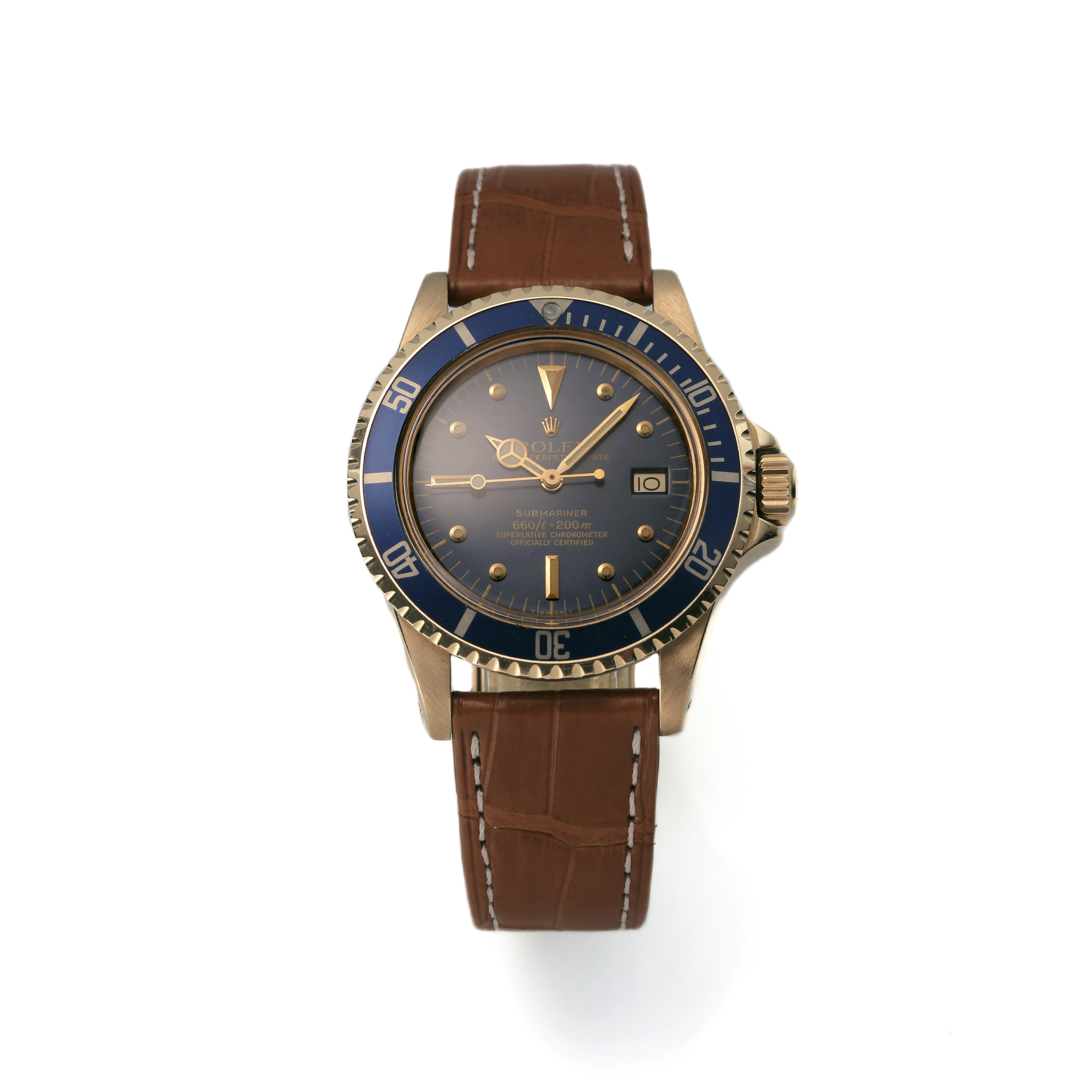 A striking and charismatic precious-metal Submariner, combining a desirable blue nipple dial, full yellow-gold case architecture, and preserved vintage character, a powerful and compelling opportunity for collectors seeking a reference 1680 with presence, pedigree, and enduring appeal.