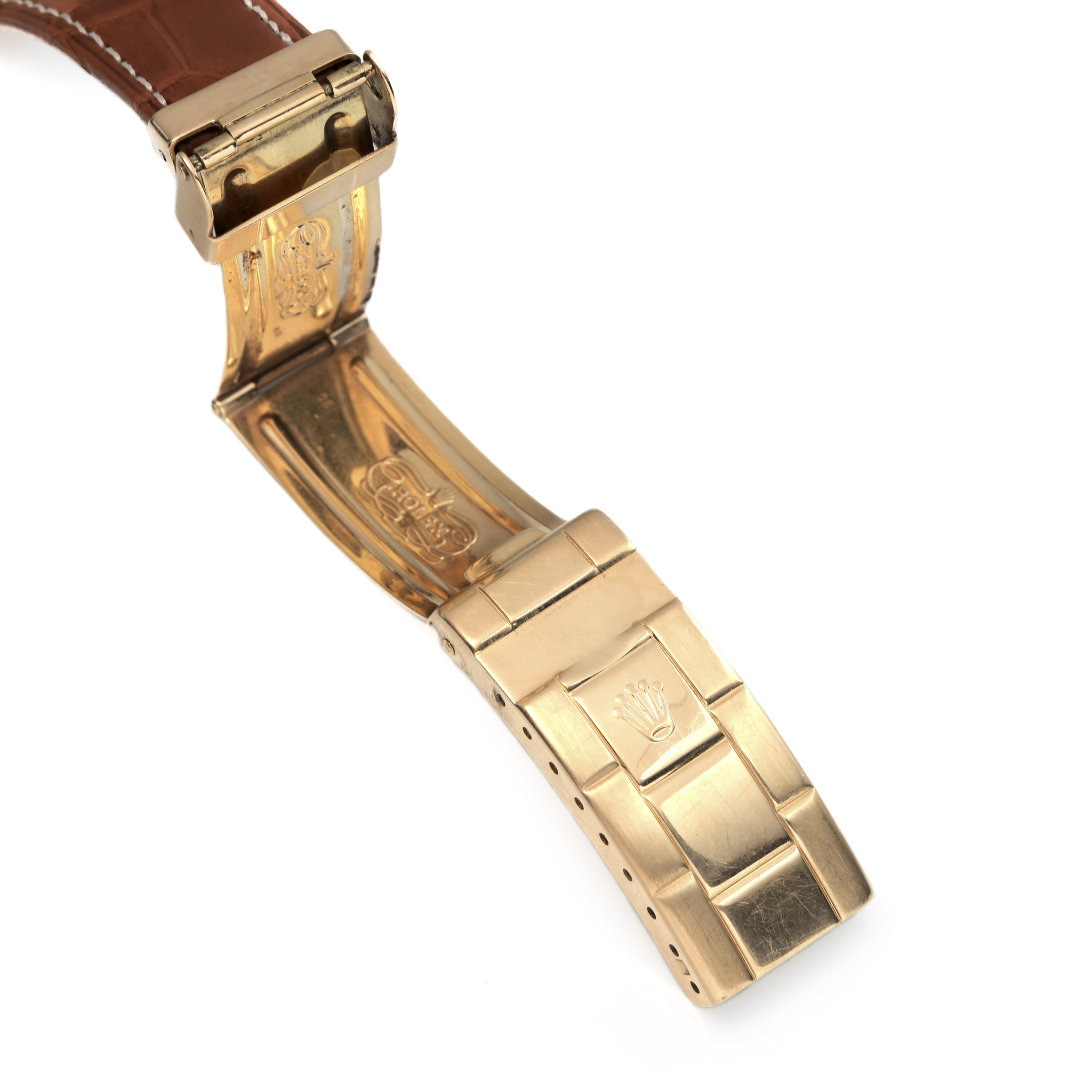 The robust 18K yellow-gold Oyster case remains full and impressive, visually enhanced by the unidirectional dive bezel fitted with a correct blue insert to match the dial. Completing the look, the watch is paired with a leather strap with an 18K Rolex buckle, offering comfort while preserving the strong precious-metal identity.