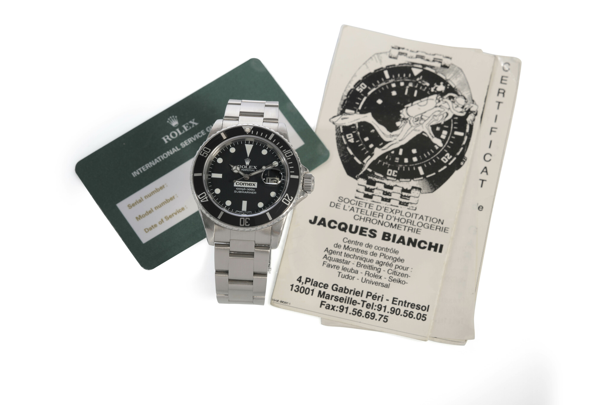 A very rare and historically important stainless steel automatic diver’s wristwatch with date, helium escape valve, comex logo dial, full serial engraved inside the backcase, documentation from jacques bianchi marseille and rolex service from 2014.