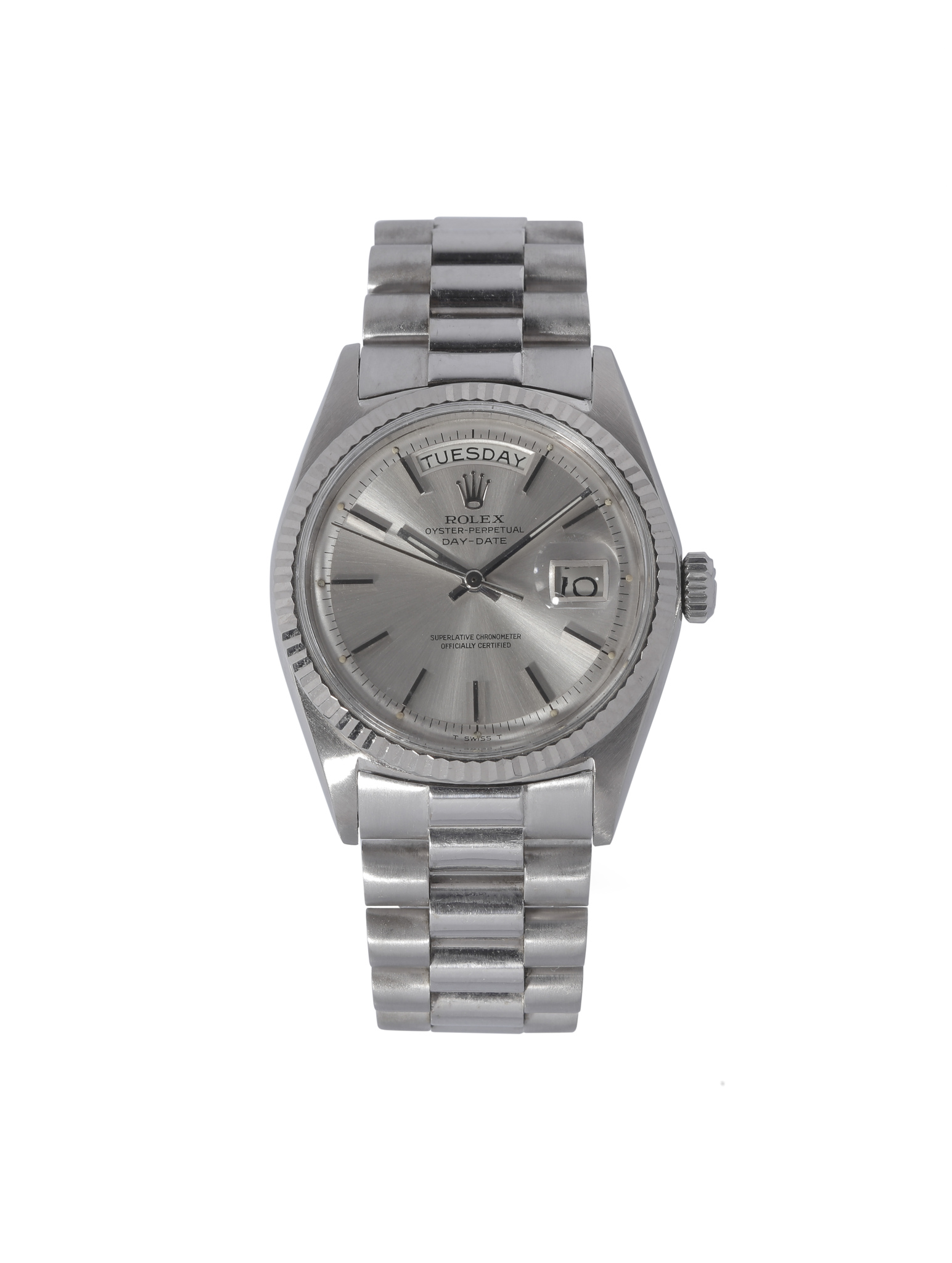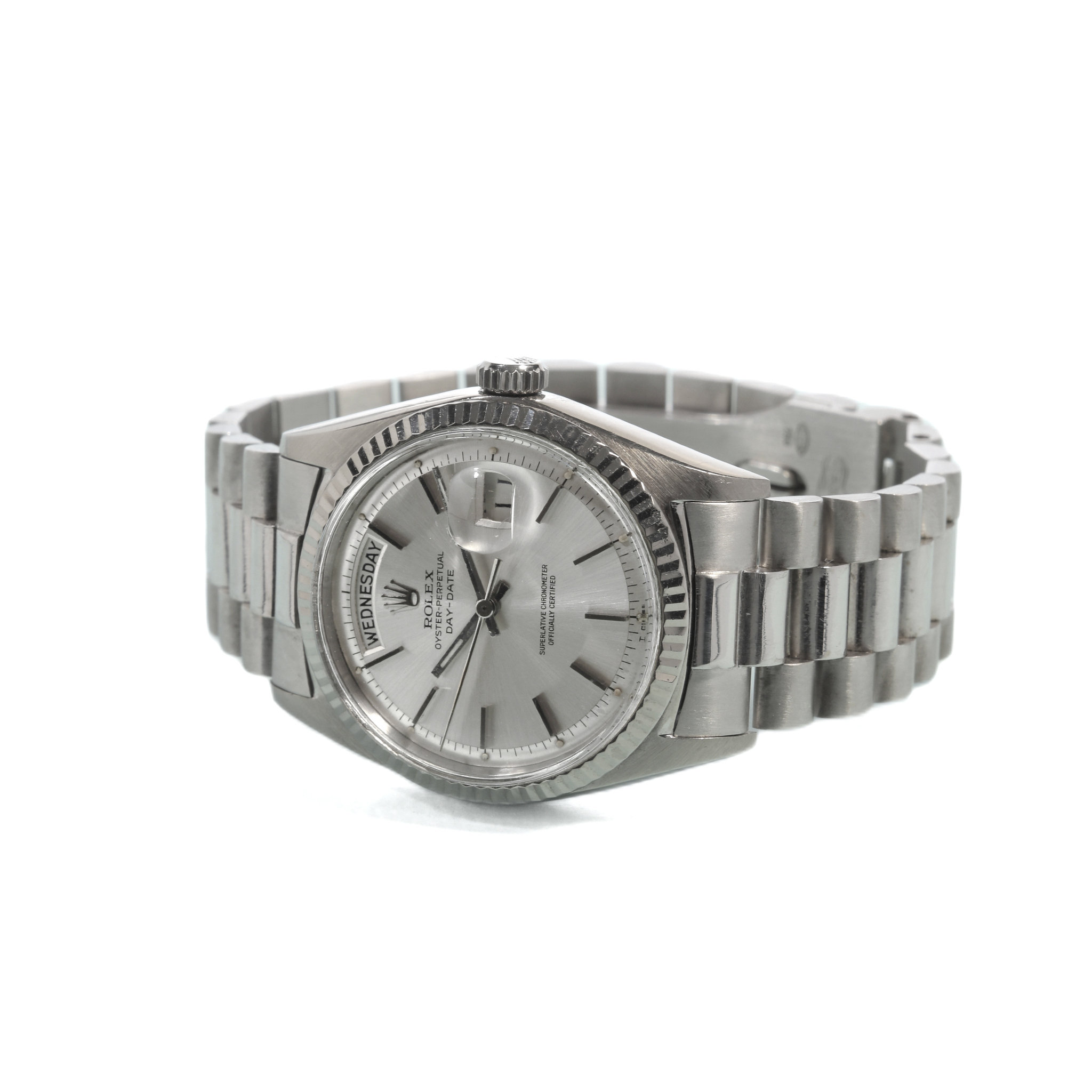 An elegant and timeless interpretation of Rolex’s most prestigious model, this Day-Date reference 1803 in solid white gold embodies the sophistication and powerful discretion that have defined the “President” line since its debut. Produced circa 1972, the watch pairs the iconic fluted bezel with a beautifully preserved silver dial, achieving a refined monochromatic aesthetic highly coveted among collectors of precious-metal Rolex.