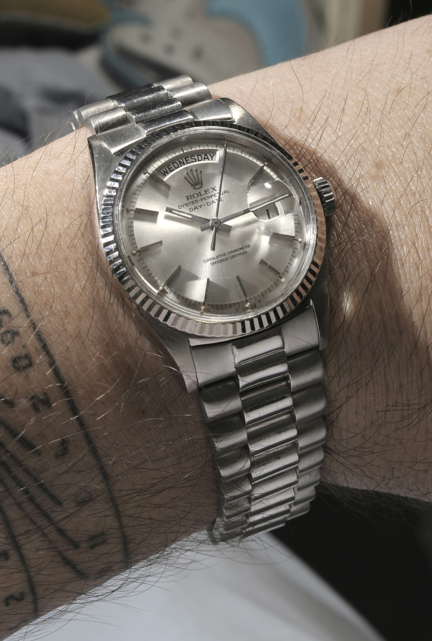The dial presents a clean and harmonious layout with english-language calendar indications, crisp black typography, and applied white-gold baton indexes. The hands have been professionally relumed, preserving visibility while maintaining coherence with the original luminous accents of the period. The “Superlative Chronometer Officially Certified” designation underscores the technical excellence delivered by the caliber 1556, one of Rolex’s most reliable automatic day-date movements of the era.