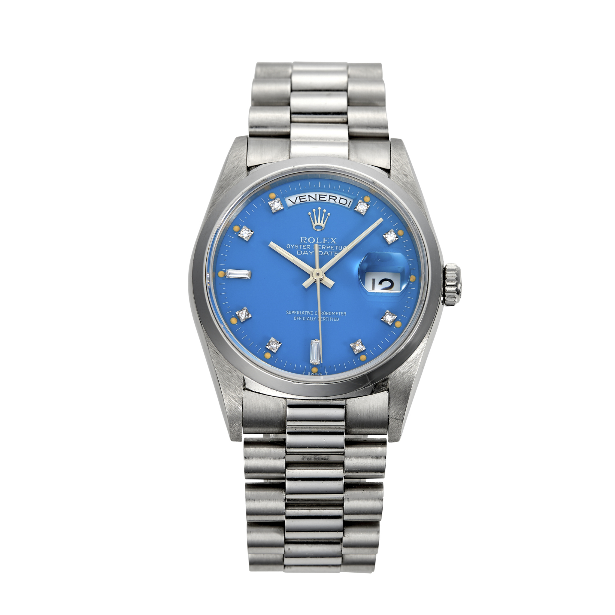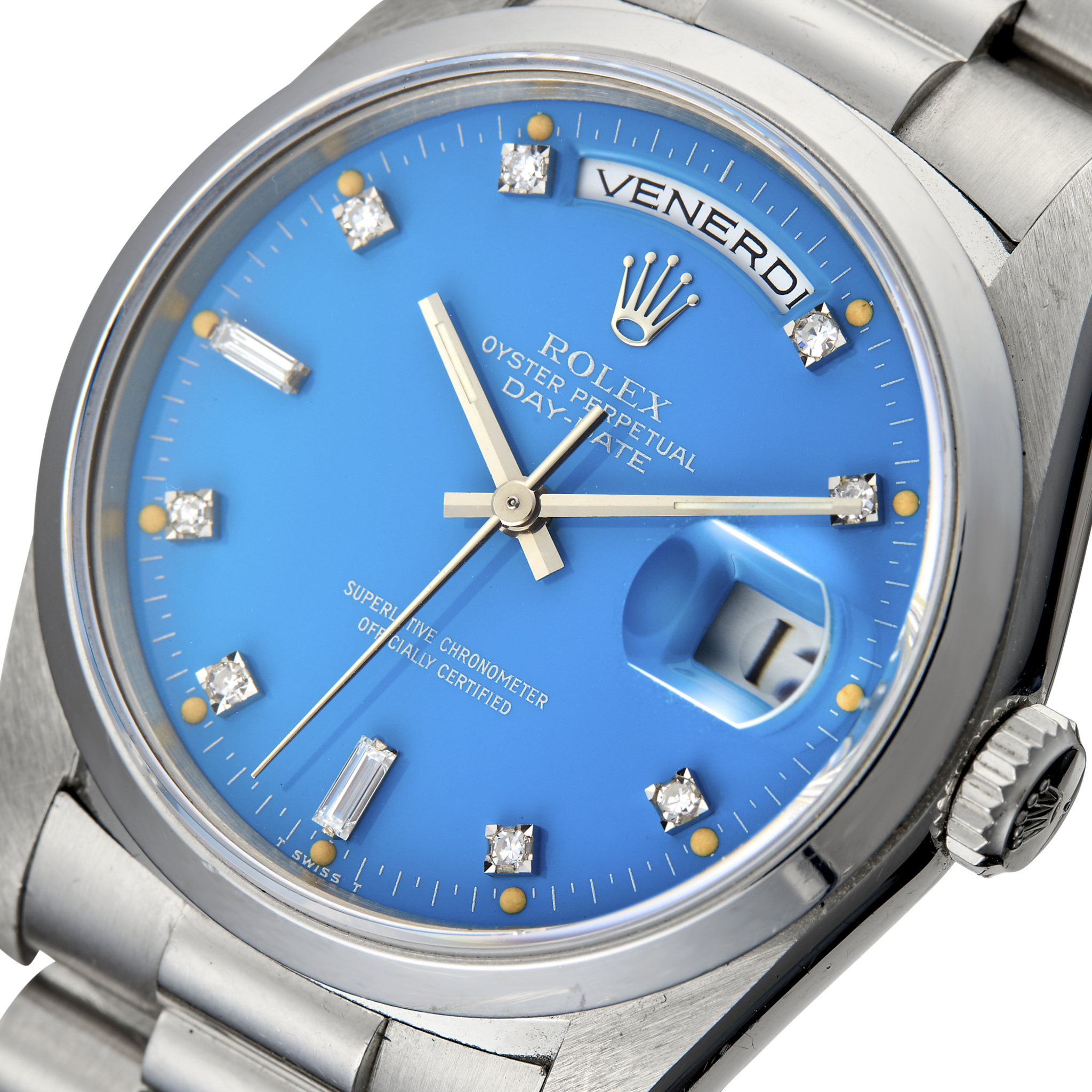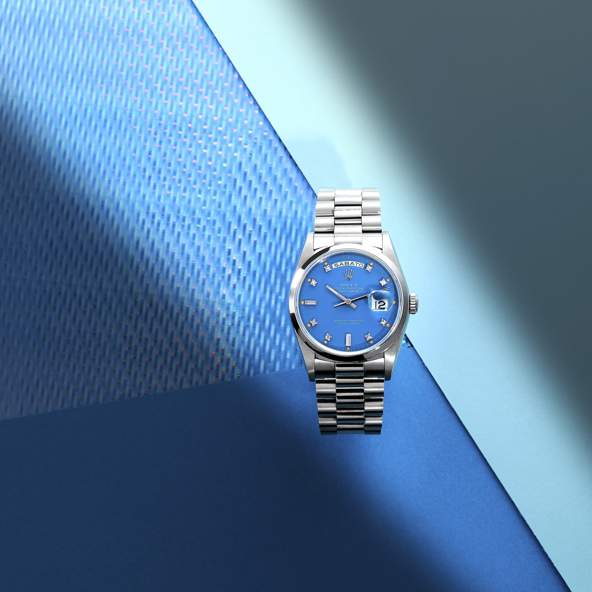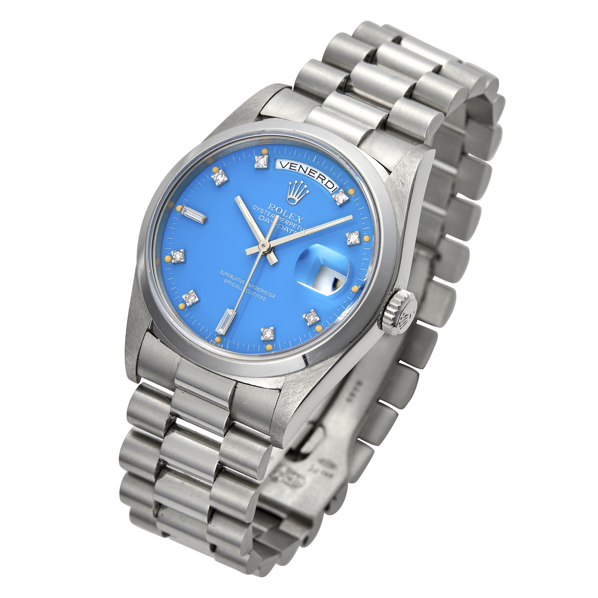 These particularities make it, without a doubt, one of the most attractive Day-Dates. Bright coloured lacquered dials such as this one are known to collectors as Stella dials, a term that evokes the star-like brilliance and daring chromatic palette that Rolex experimented with during one of its most artistically expressive periods. Stella dials in platinum Day-Dates are extraordinarily rare, and their luminous tones have become objects of cult fascination among connoisseurs.